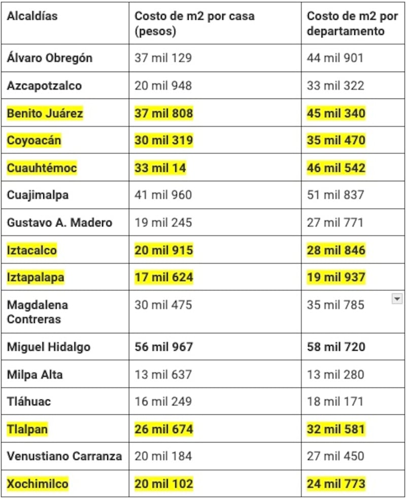 Algunas de estas proyectan incrementos en los precios de casas y otros en los departamentos; sin embargo, en casos como los de Iztacalco e Iztapalapa, los aumentos se verán reflejados en ambos tipos de inmuebles; en demarcaciones como Xochimilco solo las casas; y en casos como el de Coyoacán y Tlalpan son las viviendas de lujo las que se están revalorizando en los últimos años.