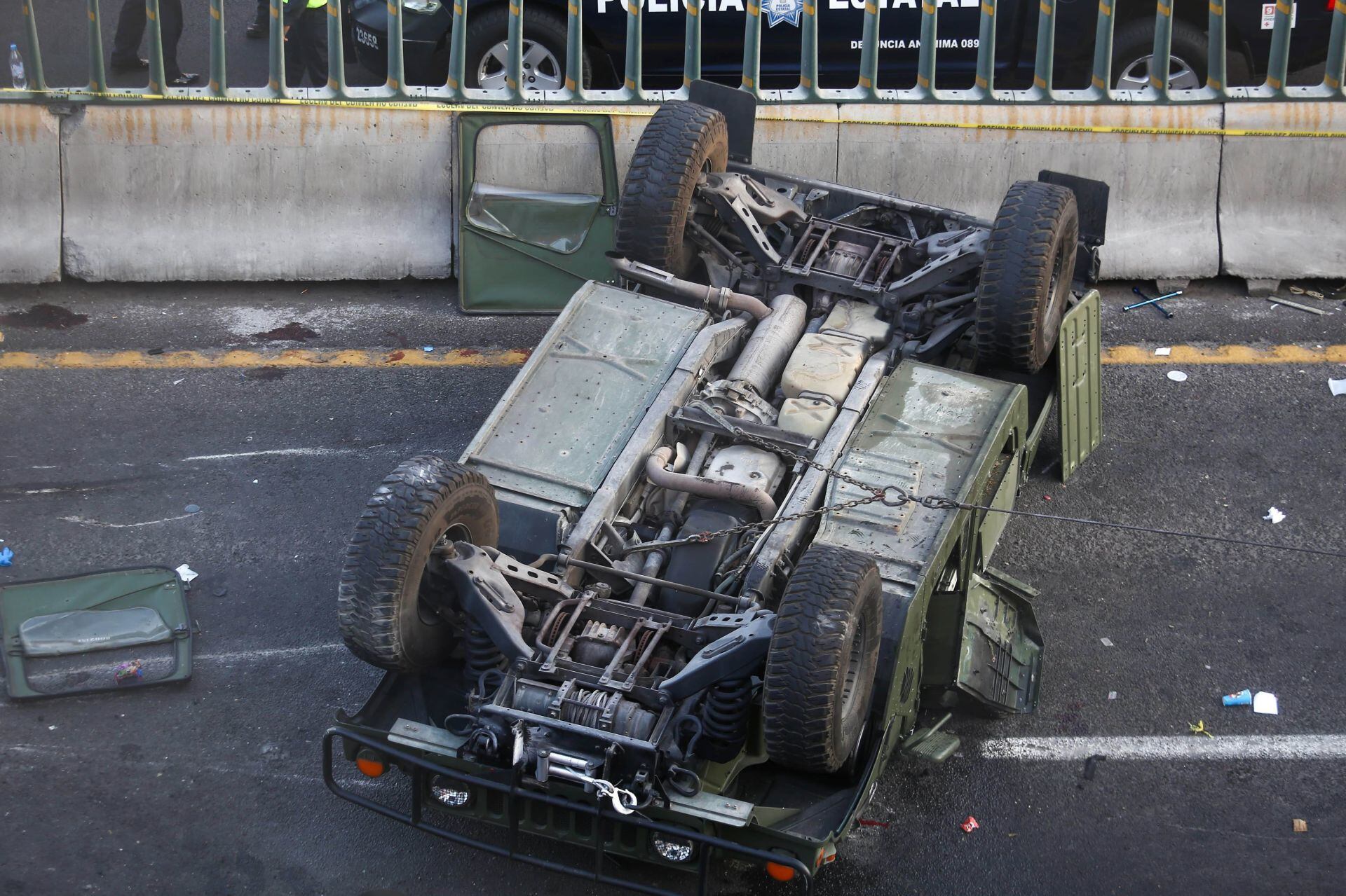 En videos que circulan en redes sociales se observa a la unidad con las puertas desprendidas y las llantas hacia arriba, mientras un militar está tirado sobre la autopista sin moverse. Varias personas intentaron voltear la pesada unidad, pero sin éxito.