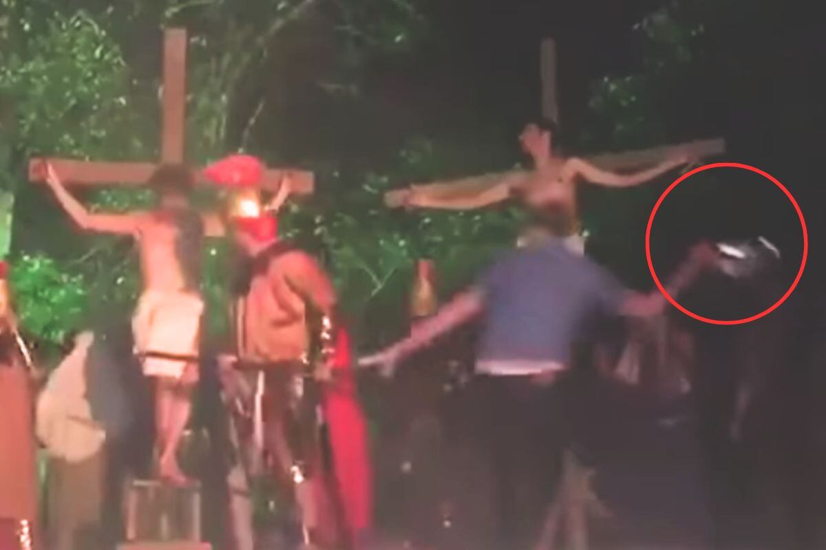 El incidente ocurrió durante una interpretación de la Pasión de Cristo, donde un hombre, en un acto que parecía sacado de una película épica, irrumpió en el escenario equipado con un objeto metálito que parece ser una cazuela o casco de motociclista.