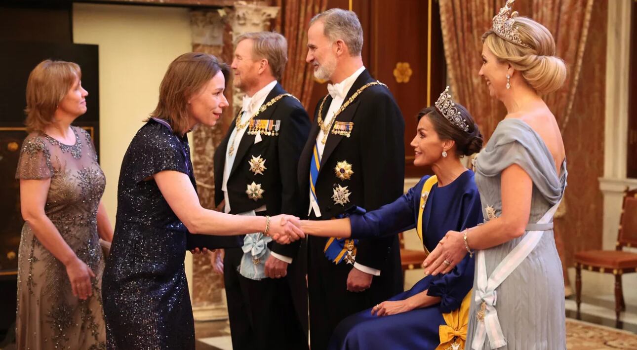 Una vez más, la reina Letizia Ortiz ha protagonizado una anécdota durante su visita a los Países Bajos. Las imágenes muestran a la monarca vestida de gala saludando sentada en el besamanos de la gala ofrecida por los reyes en el Palacio Real de Ámsterdam, acompañada del rey Felipe VI.