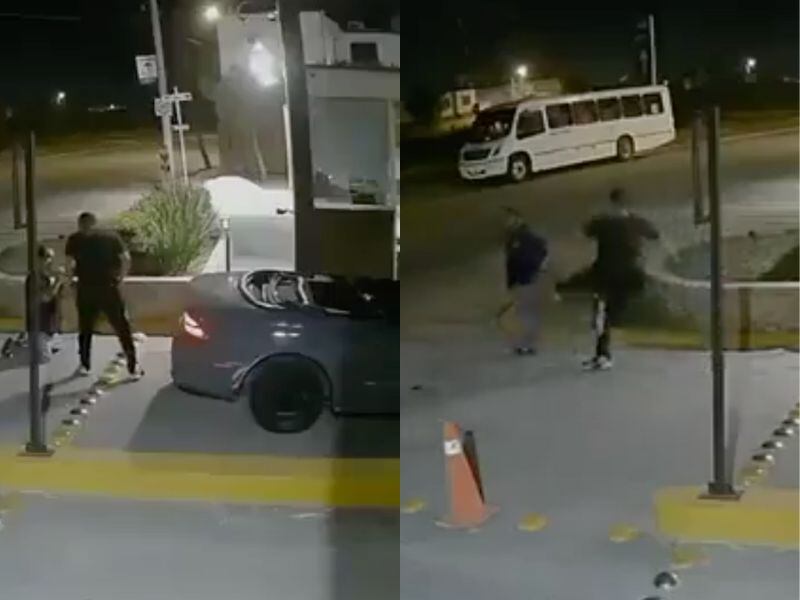 Aunque el portero consigue incorporarse y sentarse en una jardinera, la agresión no cesa, cuando camina unos pasos para alejarse de Dena, el hombre lo patea y golpea, provoca que de nuevo caiga al piso.