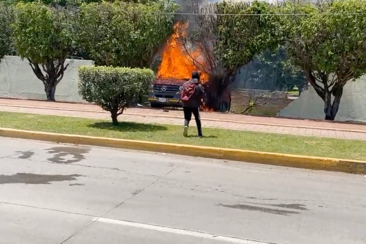 Como parte de las manifestaciones, los encapuchados realizaron pintas e impactaron una camioneta roja contra una de las bardas de la zona militar 35, para luego prenderle fuego al vehículo. El incendio fue sofocado por bomberos y cuerpos de Protección Civil que pronto llegaron al lugar.
