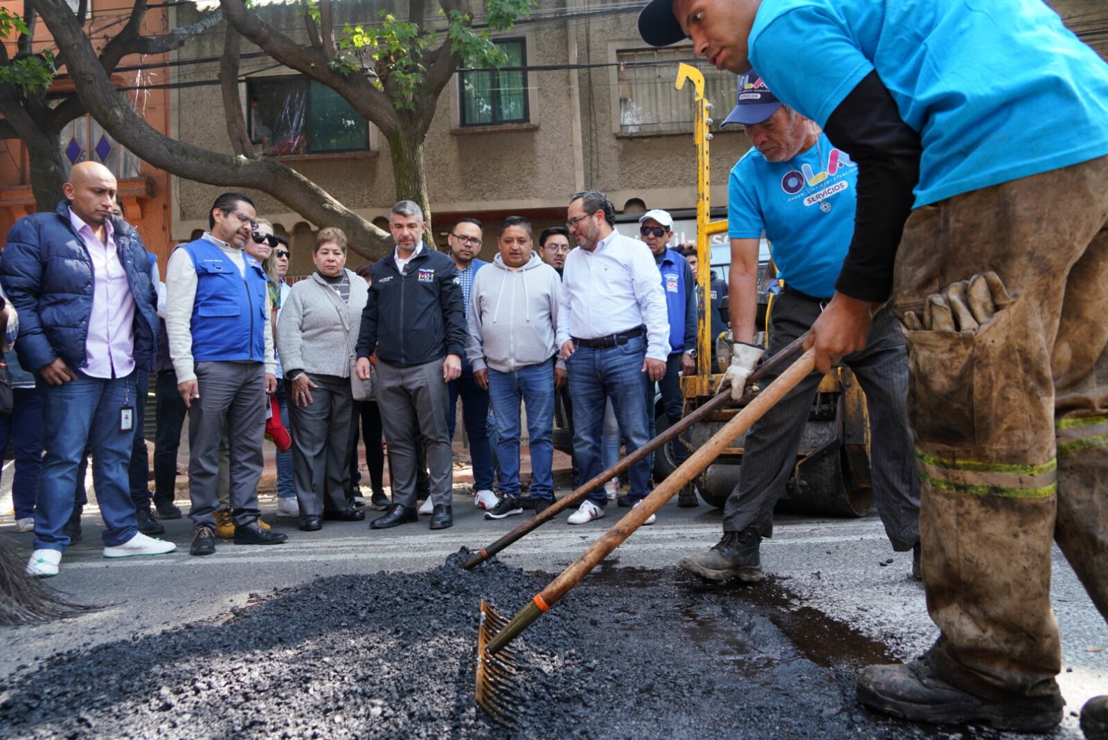 Al término de la conferencia, acudió con su equipo de trabajo y una cuadrilla de la OLA de Servicios, de la Dirección Ejecutiva de Servicios Urbanos, a la que denominó “heroico cuerpo” de antibaches, a realizar los primeros trabajos en la en la calle Minería, esquina con José Martí, en la colonia Escandón I.