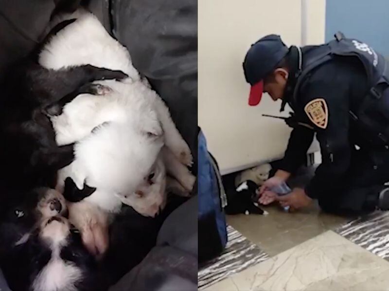 Uno de los policías abrió la mochila y se encontró a los cuatro “peluditos”, dos negros y dos blancos, los animales fueron sacados de la mochila y les dieron agua y alimento, a simple vista se notaban en buen estado de salud, solo un poco deshidratados.