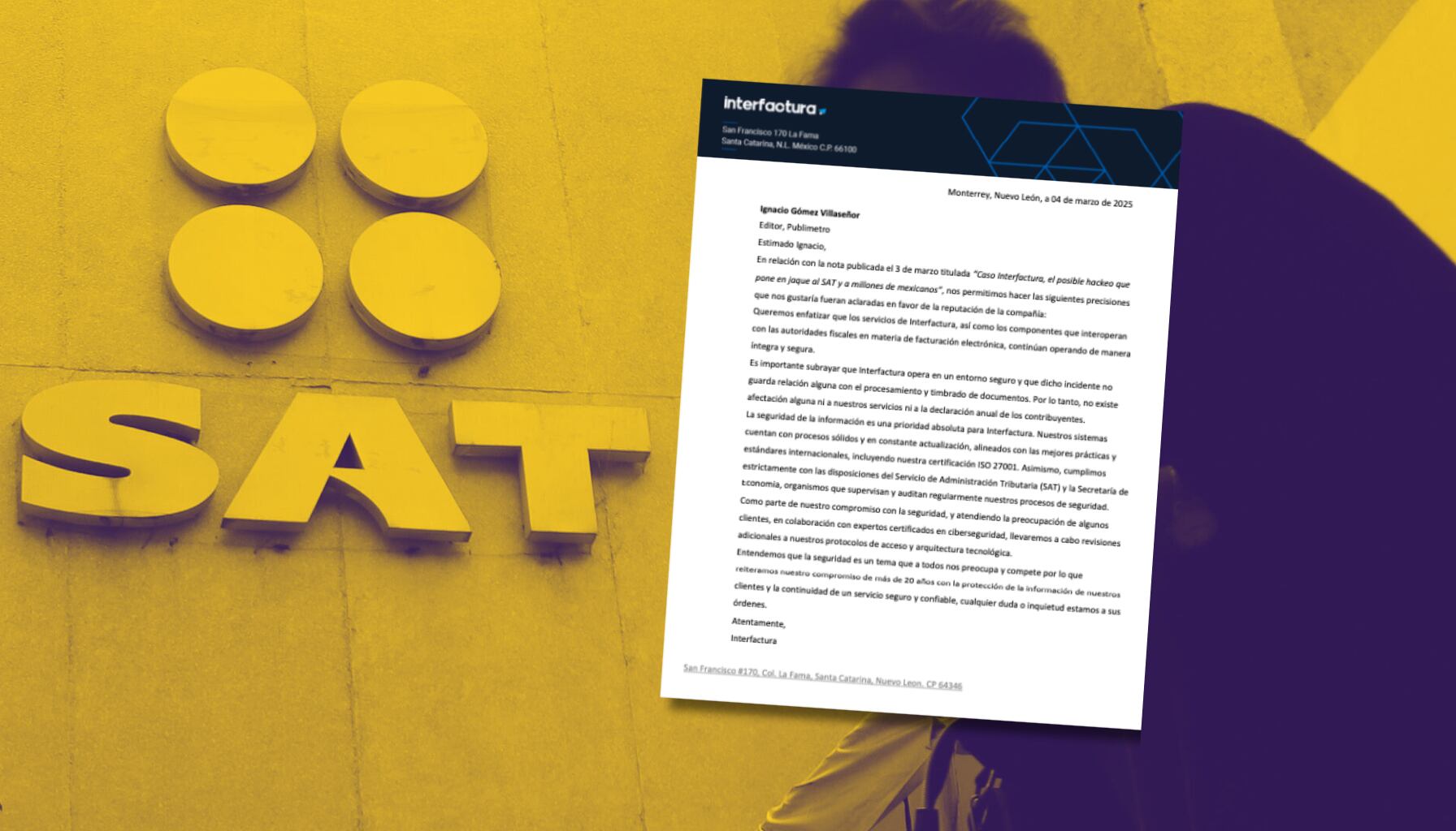 En su mensaje, Interfactura destacó que sus sistemas están certificados bajo la norma ISO 27001 y que cumplen con los estándares de seguridad exigidos por el SAT y la Secretaría de Economía; no obstante, reconocieron que, tras el incidente, han decidido realizar una revisión adicional de sus sistemas.