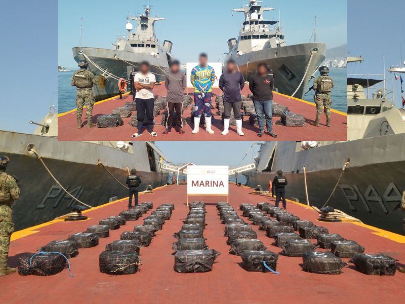 La Secretaría de Marina (Semar) aseguró más de cuatro toneladas de cocaína en dos operativos realizados en las costas de Guerrero, en una de ellos se detuvo a cinco hombres que iban a bordo de una embarcación con alrededor de mil 800 kilogramos de droga; mientras que en el otro, 2.4 toneladas de la misma sustancia flotaba en el mar.