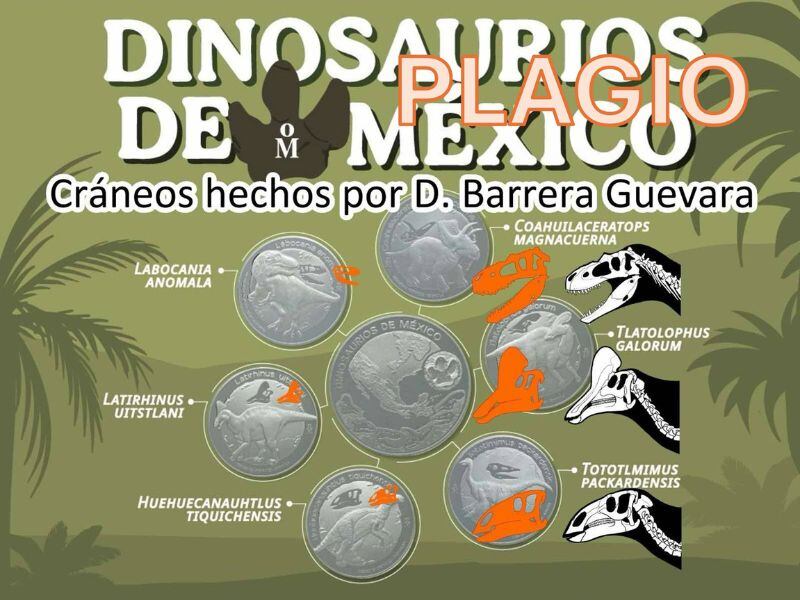 “La Casa de Moneda ha creado monedas de oro, plata y cobre de dinosaurios mexicanos. Sin embargo, usaron mi arte sin crédito, compensación ni aviso. Al igual que el paleoarte de muchos otros, como Gustavo Monroy y Alexis Uriostegui. Los juegos de monedas se venden por 4000. ¡Y yo no recibo nada! ¡Ni siquiera crédito! La mayoría de estos dinosaurios se conocen a partir de restos fragmentados (en su mayoría sin cráneo). Yo inventé esos cráneos. Y los están usando”.