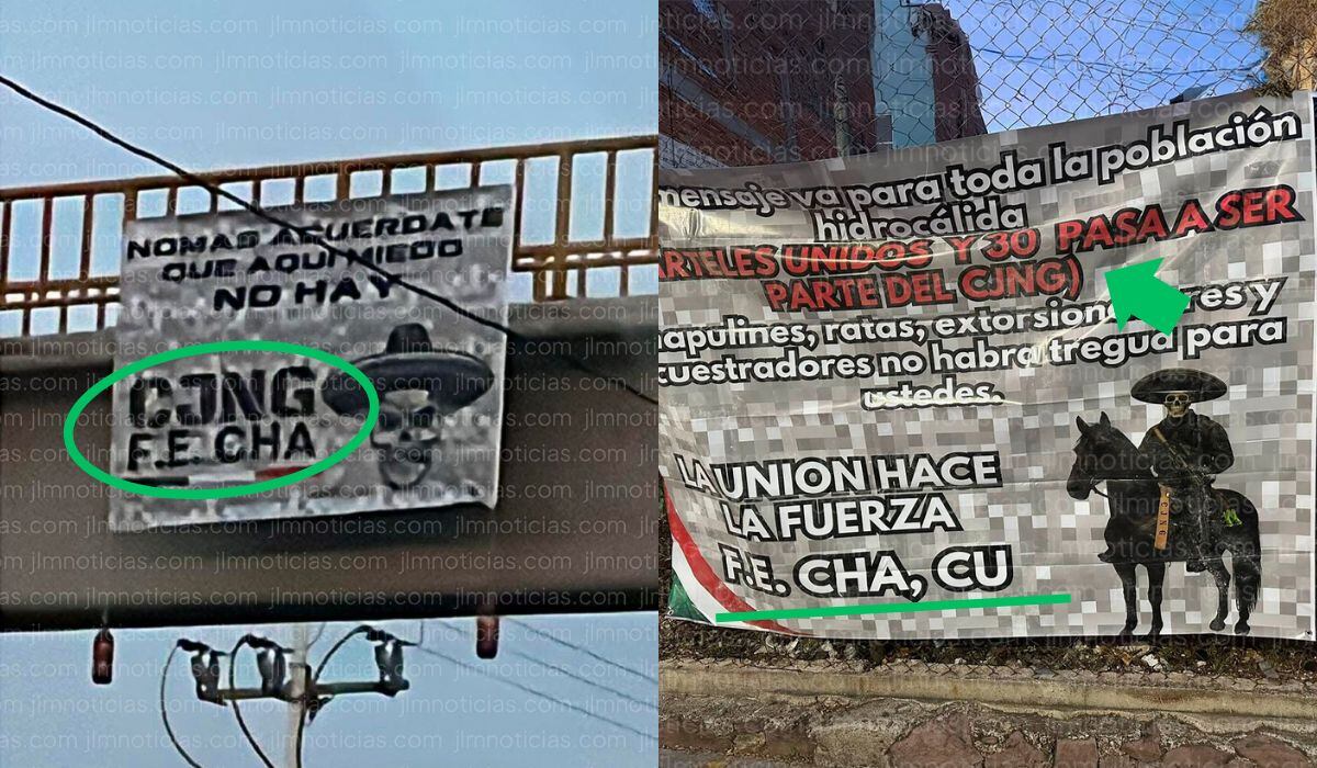 El periodista José Luis Morales difundió imágenes de dos tipos de lonas colocadas en distintos puntos de la entidad. En una de ellas, se anuncia que los grupos conocidos como Cárteles Unidos (CU) y “30” se suman al CJNG, a través de un mensaje firmado por una célula identificada como Fuerzas Especiales Charro (F.E.CHA).