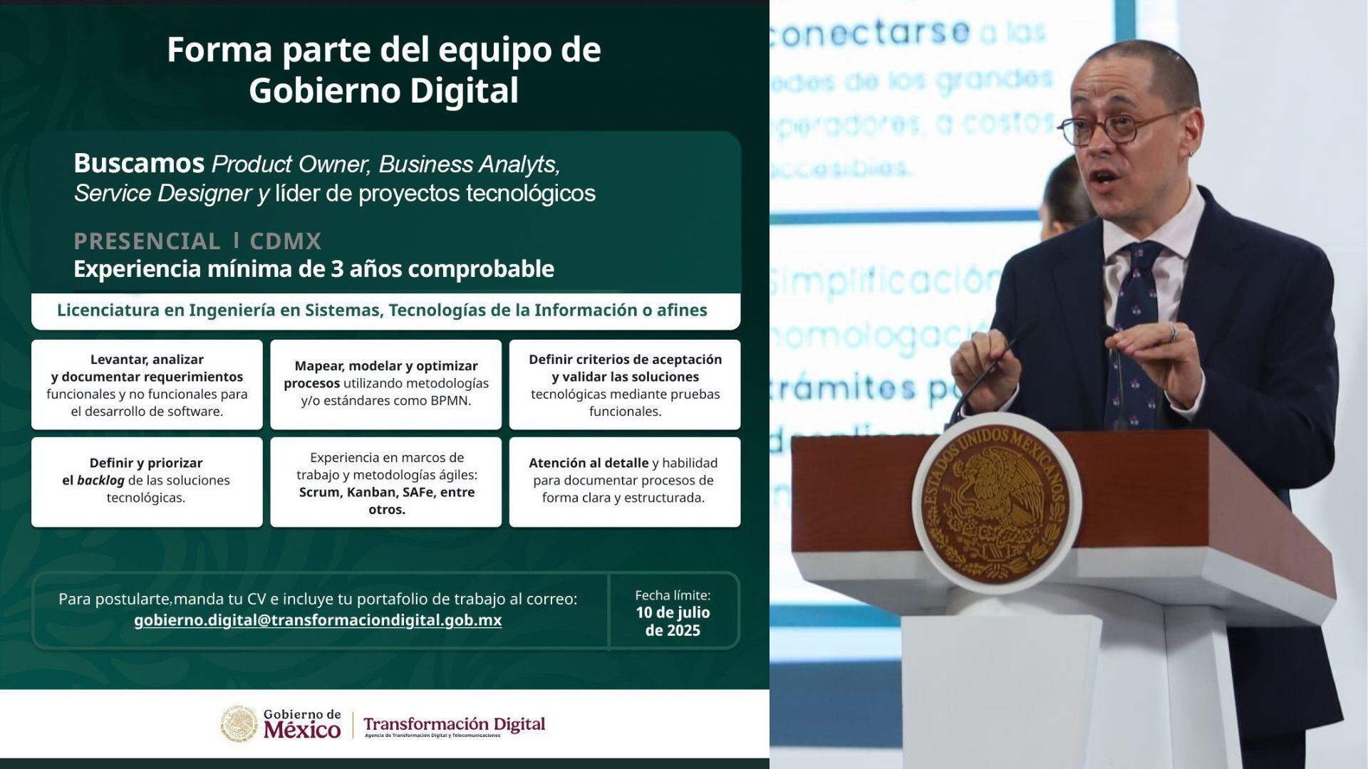 - La convocatoria estará vigente hasta el 20 de julio de 2025, y las personas interesadas pueden enviar su currículum vitae actualizado al correo: gobierno.digital@transformaciondigital.gob.mx
