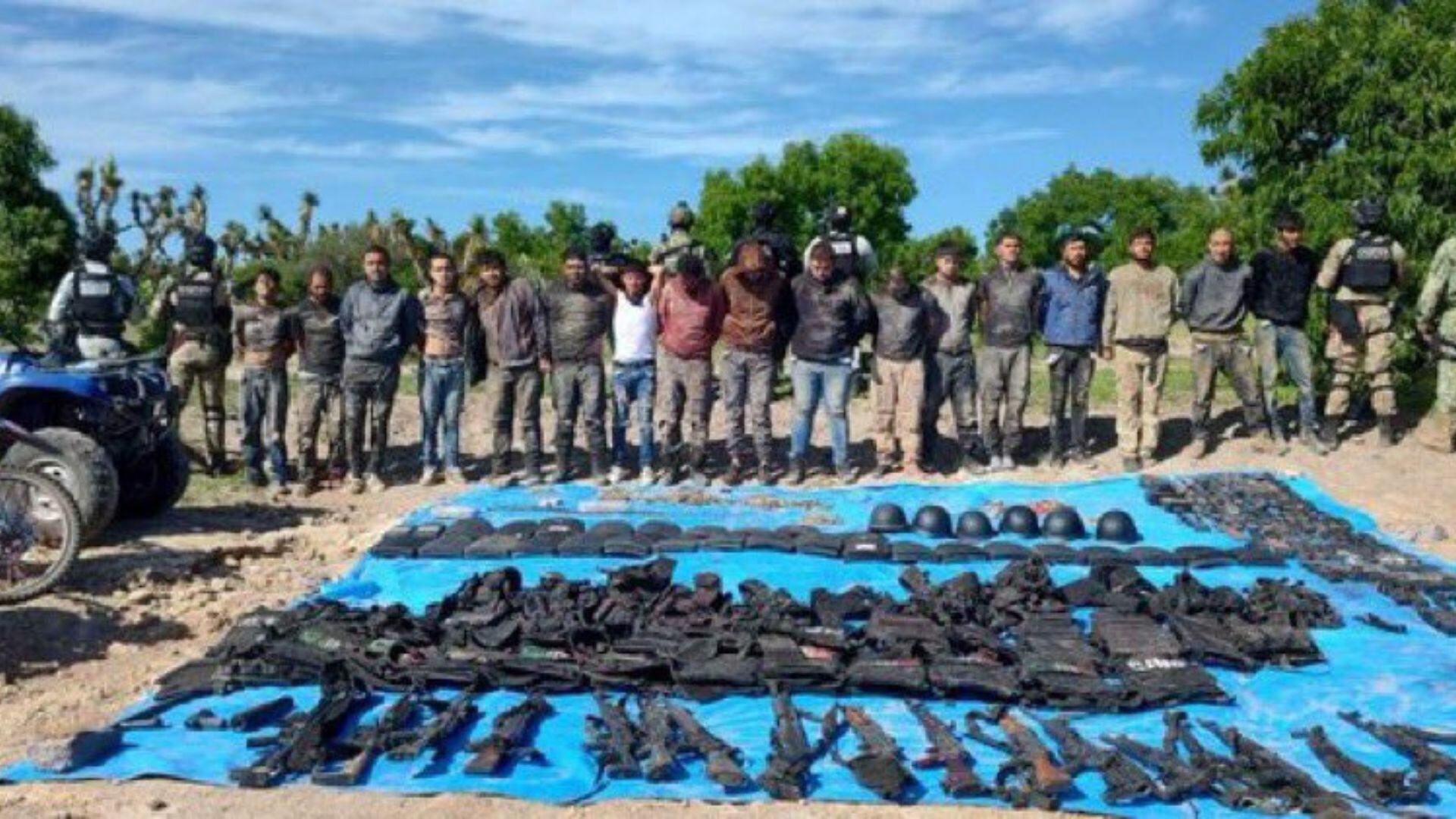 Al llegar, los agentes localizaron a varios sujetos armados con armas de alto calibre. Durante la intervención, lograron la detención de 18 personas, así como el aseguramiento de 20 armas de fuego, un aditamento lanzagranadas, 28 chalecos tácticos, cascos, cargadores, cartuchos, fornituras y un kilo de polvo blanco.
