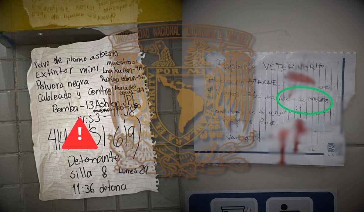 Durante los últimos días, varios planteles de la Universidad Nacional Autónoma de México (UNAM) han vivido momentos de alarma tras el hallazgo de amenazas de bomba, algunas acompañadas de mensajes violentos e incluso manchas de sangre.