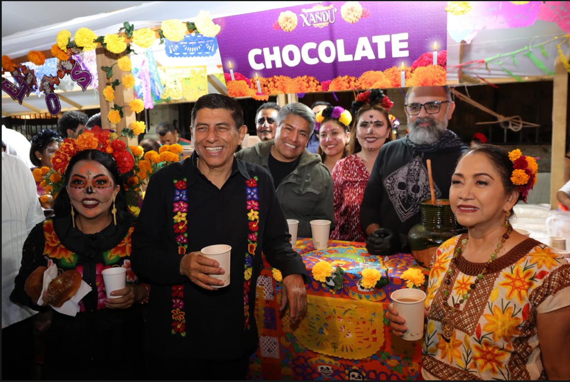 Entre flores de cempasúchil, el inconfundible olor a copal y música tradicional; el gobernador Salomón Jara Cruz junto a la Presidenta Honoraria del Sistema DIF Oaxaca, Irma Bolaños Quijano; compartieron con cientos de personas chocolate, café, pan y tamales en la Verbena Popular Xandú.