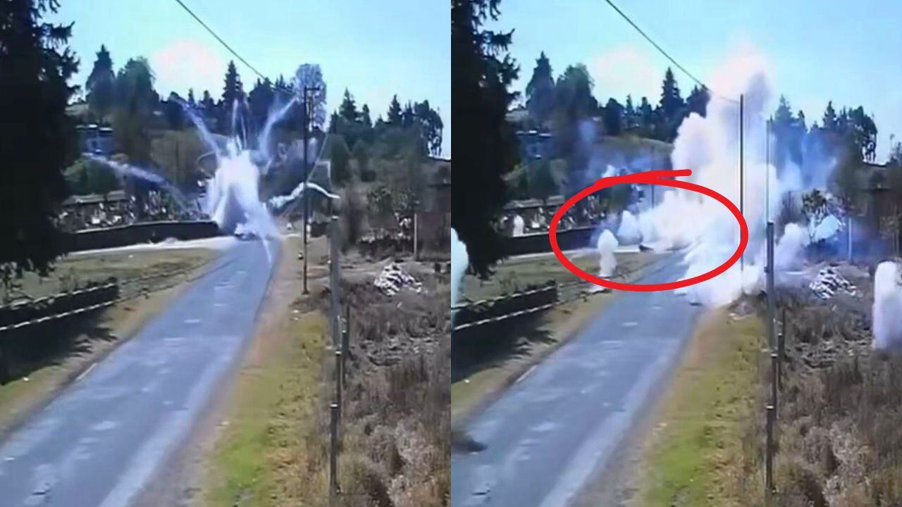 El incidente fue captado por cámaras de vigilancia de un domicilio, en las que se observa al conductor circulando tranquilamente hasta que uno de los artículos pirotécnicos que trasladaba detona repentinamente, generando una gran columna de humo y fuegos artificiales encendidos.