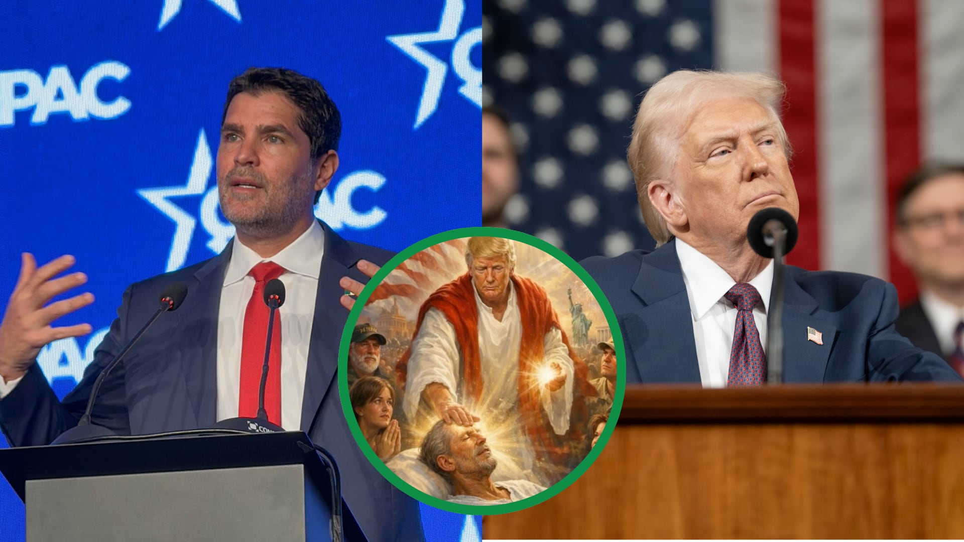 La ilustración muestra a Trump en una posición central, rodeado de símbolos religiosos y patrióticos, mientras parece “curar” a un hombre, con ángeles y una bandera de Estados Unidos al fondo. Este tipo de representación generó críticas por parte de sectores religiosos, al considerar que equipara al mandatario con poderes divinos.