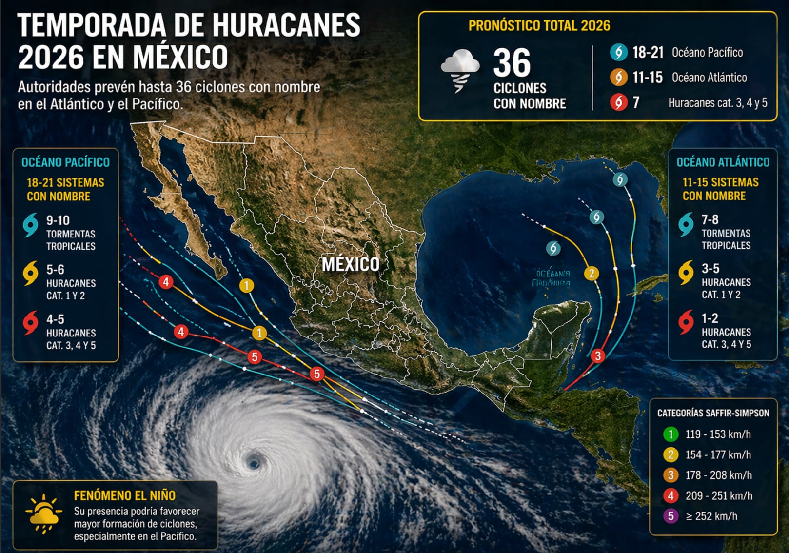 El Servicio Meteorológico Nacional (SMN) prevé que entre 18 y 21 ciclones se desarrollen en el océano Pacífico, una cifra superior a la media climatológica de 15 sistemas registrada entre 1991 y 2020.
