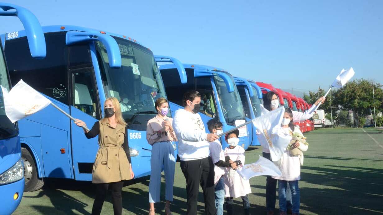 A bordo de 18 autobuses, partieron los primeros 500 menores, de 5 a 11 años, que serán beneficiados con el Programa Transfronterizo de Vacunación, que es impulsado por el gobernador Samuel García.