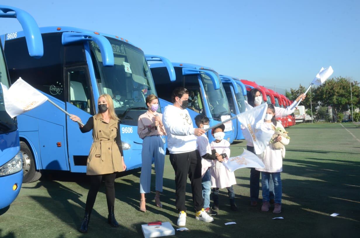 Desde temprana hora, los niños se dieron cita en los patios de Transportes Senda, ubicados en Bernardo Reyes, en Monterrey, de donde salieron a la frontera de Nuevo Laredo.
