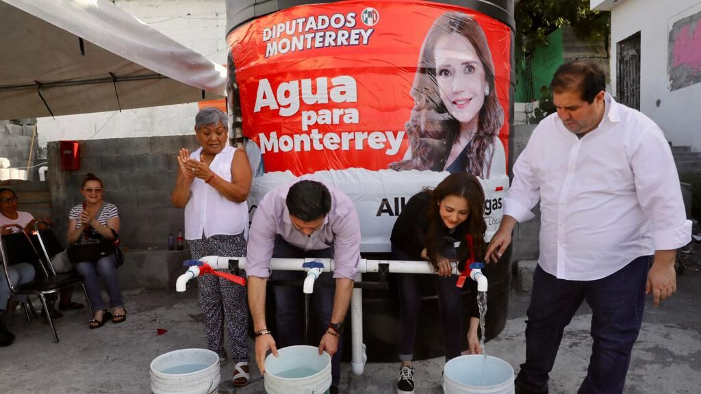 En medio de la crisis de agua que afecta a Nuevo León, los priistas han realizado visitas a colonias populares en donde reparten tinacos y cubetas con su imagen: entre ellos los que han incurrido en esta práctica son: la diputada federal, Karina Barrón y las locales: Alhinna Vargas e Ivonne Álvarez, así como Perla Villarreal y Ana González.