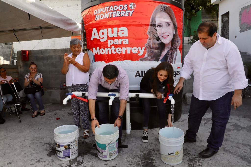 En medio de la crisis de agua que afecta a Nuevo León, los priistas han realizado visitas a colonias populares en donde reparten tinacos y cubetas con su imagen: entre ellos los que han incurrido en esta práctica son: la diputada federal, Karina Barrón y las locales: Alhinna Vargas e Ivonne Álvarez, así como Perla Villarreal y Ana González.
