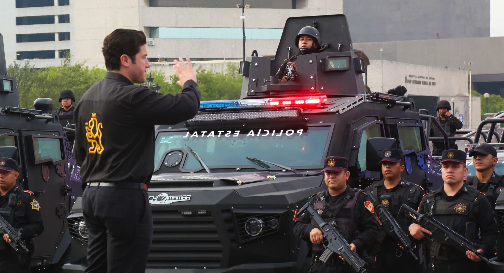 “Cada vez más ir haciendo una pirámide que va a estar tan fuerte que no habrá grupo ni delincuencia que pueda con el estado de fuerza de Nuevo León. Autoridades federales, estatales, municipales, coordinadas, organizadas, con pruebas de confianza, con el mejor armamento, con el mejor equipo vamos a blindar el estado y quien la haga la va a pagar”, expresó en la ceremonia de entrega de equipo.