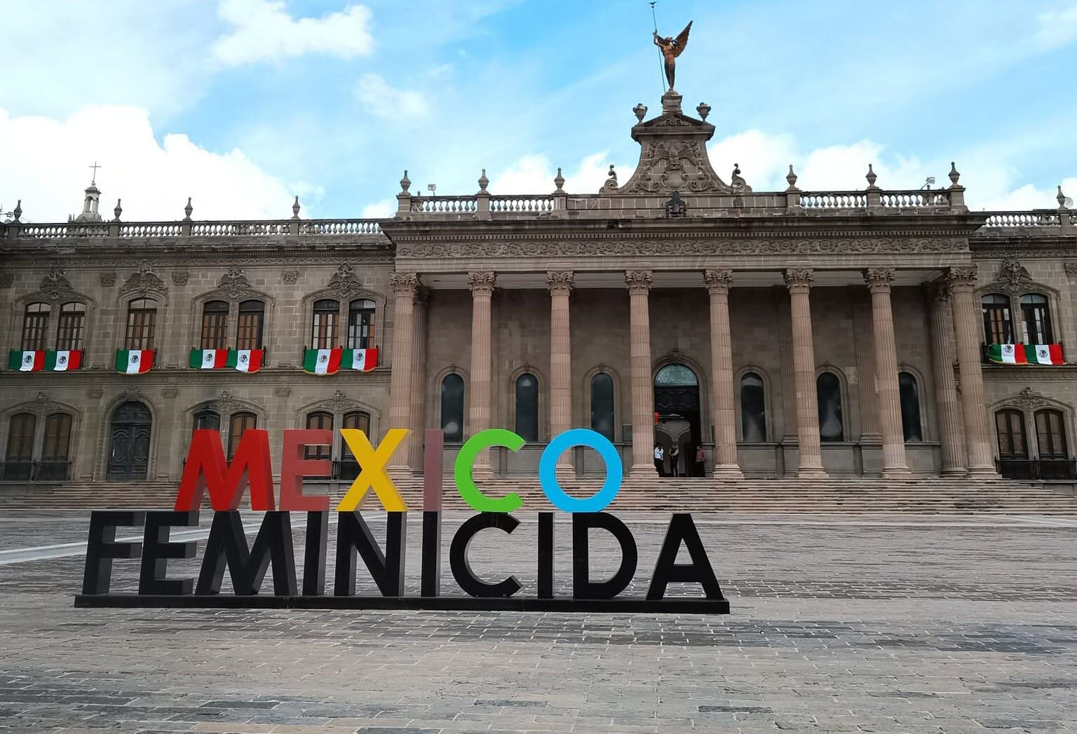 Como una forma de protestar por el incremento de crímenes en contra de mujeres, un grupo anónimo colocó en la Explanada de los Héroes, en Monterrey, justo frente a Palacio de Gobierno, el mensaje: “México Feminicida”.