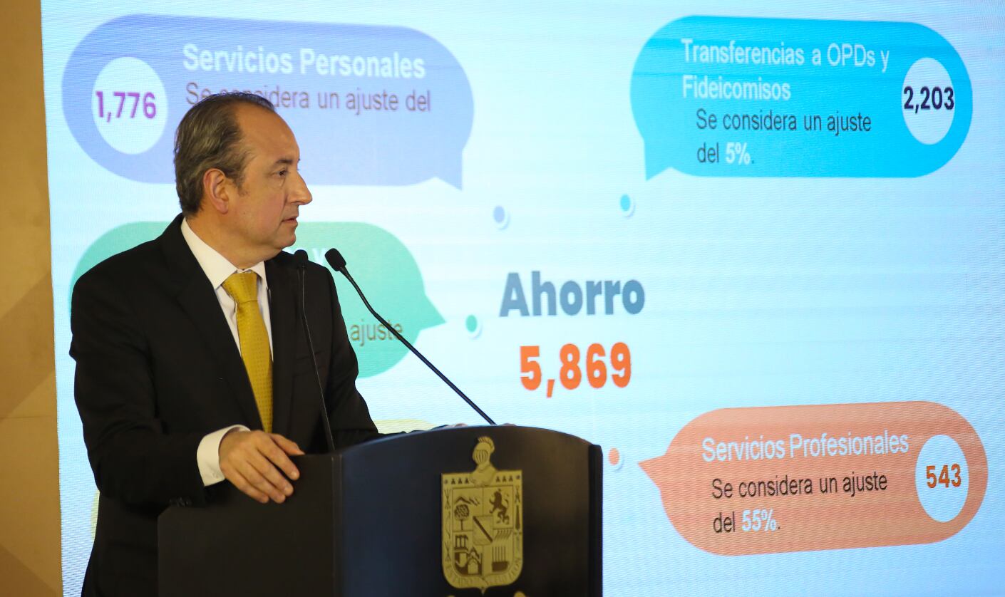 Anunció que se propuso un ajuste en el gasto corriente por 5 mil 869 millones de pesos, en servicios personales, servicios generales, materiales y suministros, servicios profesionales y transferencias a organismos públicos descentralizados y fideicomisos.