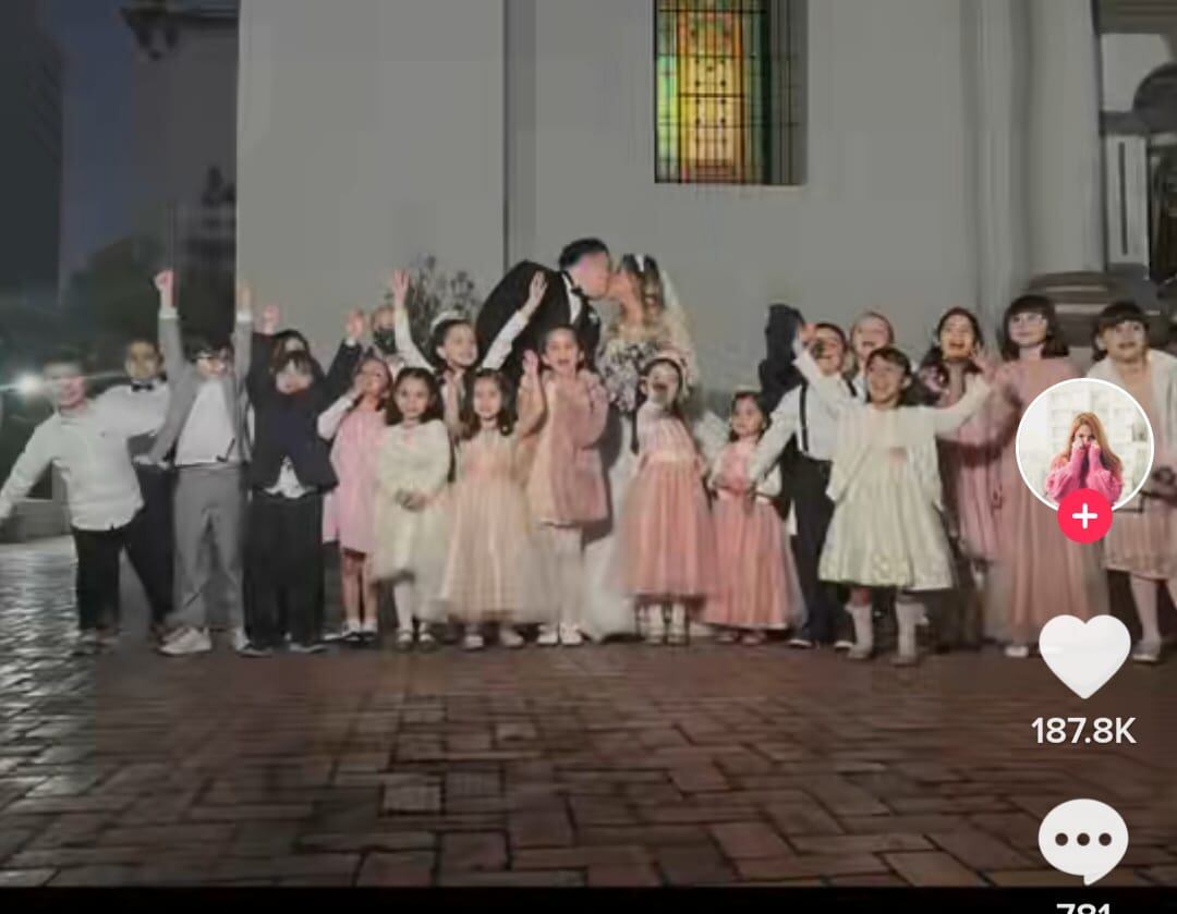 En la grabación se puede ver a los chicos vestidos de forma muy elegante y entregando rosas a la novia para que las depositara en el altar de la Virgen.
