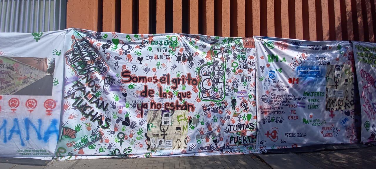 Un total de 23 lonas lucen en la pared de la calle Zuazua. En ellas se reprodujeron todas las expresiones escritas en la pared del Museo durante las actividades por el Día Internacional de la Mujer en marzo de 2022.