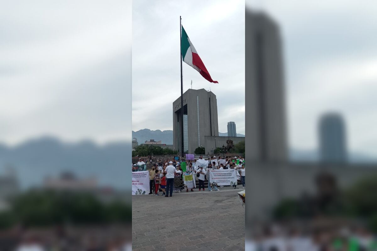 Después de caminar desde Cintermex hasta la Macroplaza, unas 150 personas de diferentes asociaciones se instalaron frente al Palacio de Gobierno con pancartas con las que manifestaban su rechazo a decreto que se desea implementar en la Ley de Bienestar Animal de Nuevo León.