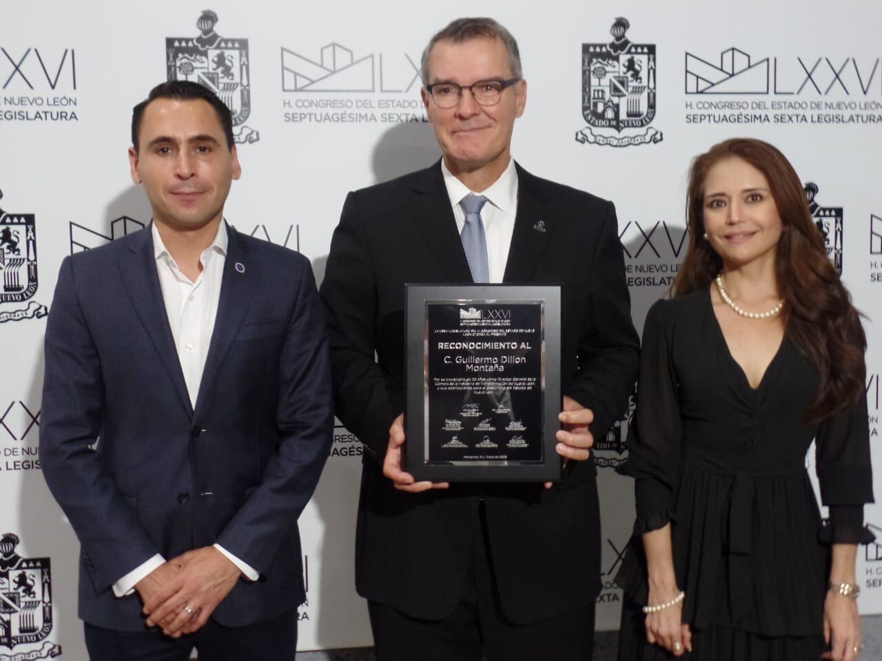 A propuesta de la vicepresidenta del Congreso, la diputada Alhinna Vargas, el Poder Legislativo entregó un reconocimiento a Dillon Montaña, por más de 20 años como director general de la Caintra Nuevo León.