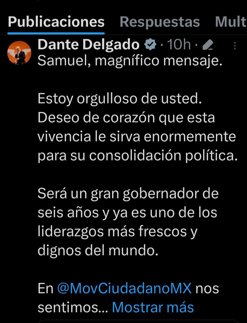 “Samuel, magnífico mensaje. Estoy orgulloso de usted. Deseo de todo corazón que esta vivencia le sirva enormemente para su consolidación política”, escribió en X el líder nacional de Movimiento Ciudadano.