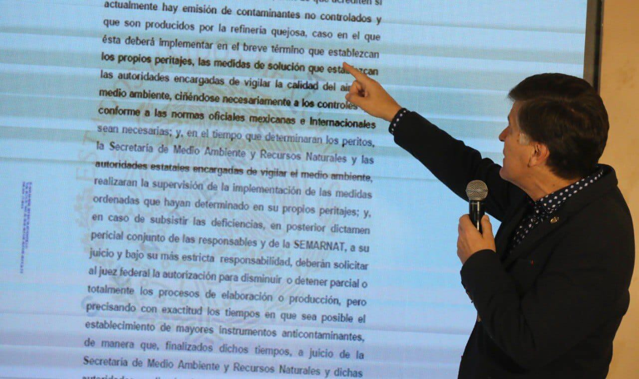 ”(En la audiencia) de parte nuestra se presentarán los medios de prueba correspondientes para acreditar que se están realizando las acciones en todas las fuentes fijas, no solo en la Refinería, tanto de competencia federal como estatal para reducir las emisiones contaminantes a la atmósfera y no de manera selectiva contra la Refinería, así como para acreditar que la Refinería de Cadereyta realiza sus actividades sin tener un control adecuado de las emisiones contaminantes”, expresó Martínez