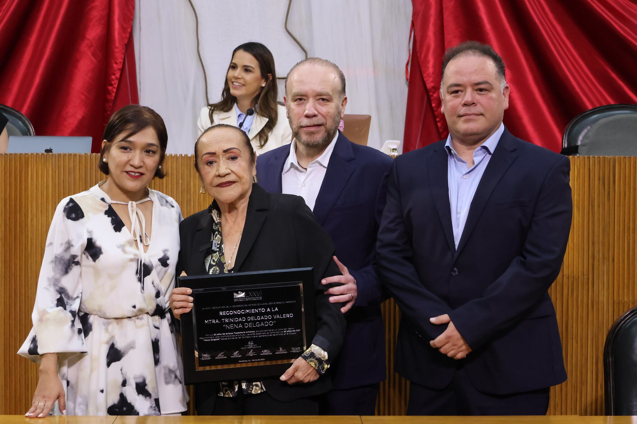 Ivonne Álvarez, promotora del reconocimiento, calificó a la Nena como toda “una leyenda, una gran institución”.“Por el amor que le imprime a su trabajo y que ha dejado una marca imborrable en la historia cultural de nuestro estado es un honor contar con la distinguida presencia de la maestra Trinidad Delgado Valero, reconocida, querida y admirada por todos nosotros como nuestra Nena Delgado”, expresó.La priista agradeció a sus compañeros Nena por haber aprobado el reconocimiento a la artista.“A todos los diputados que están aquí, gracias a su aprobación podemos llevar a cabo este homenaje a nuestra querida Nena Delgado. Desde tu origen, en aquel ejido de Anáhuac, Nuevo León lograste enfrentar todo momento y circunstancia de tu vida para llegar hasta el día de hoy, plena, realizada, hermosa y generosa con tu gente.“Sabes que cuando tenías apenas 7 años llegaste aquí a Monterrey, donde cursaste tus estudios hasta culminar como egresada de la Escuela Normal Superior de la cual te sientes sumamente orgullosa. Sabemos que te desempeñaste como directora de escuelas primarias y secundarias hasta culminar tu carrera en una primaria tras más de 30 años de servicio” indicó Álvarez.La Nena estuvo acompañada de sus hijos y nieta, además de amigos entrañables.