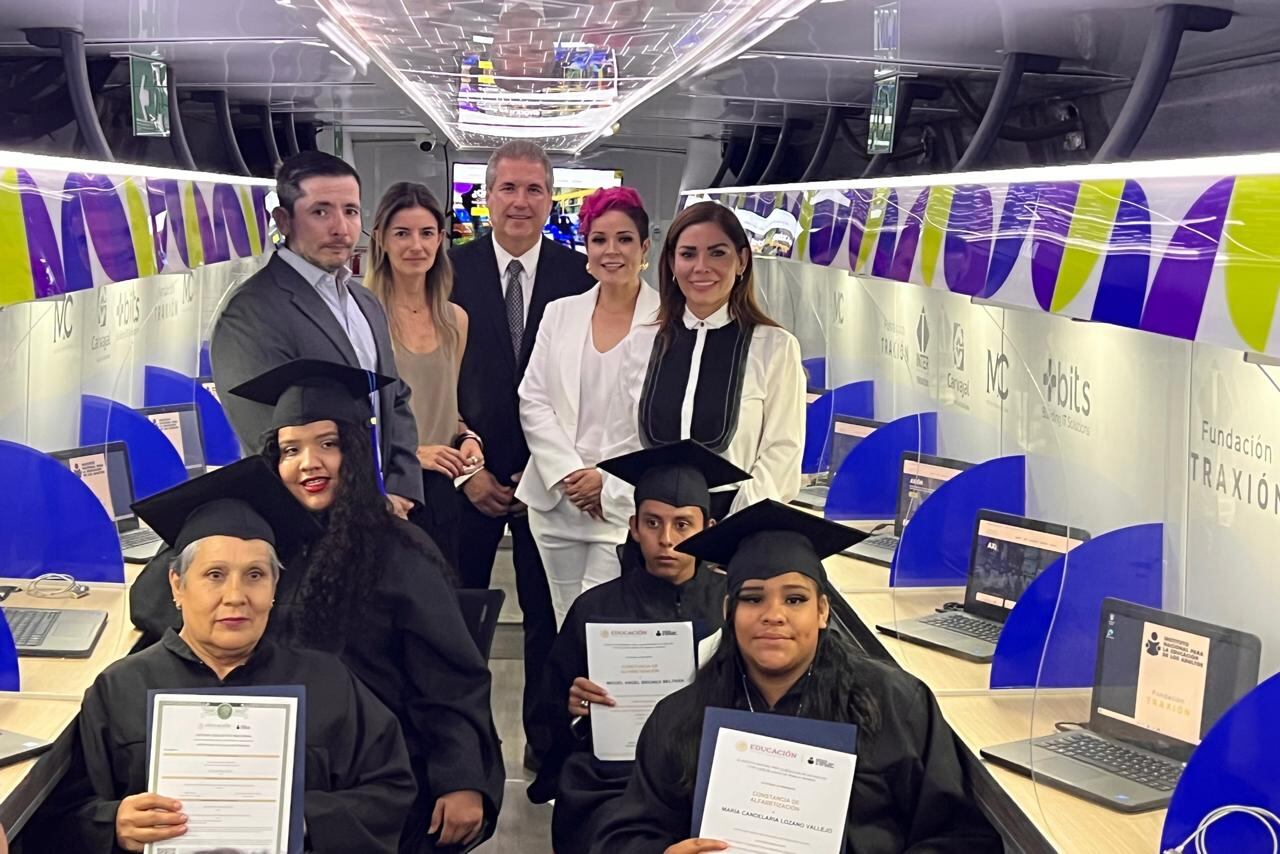 La asociación Traxión aportó la unidad. Se trata de un autobús con capacidad para 16 estudiantes, equipada con clima, laptops y salón para el maestro, entre otros beneficios.