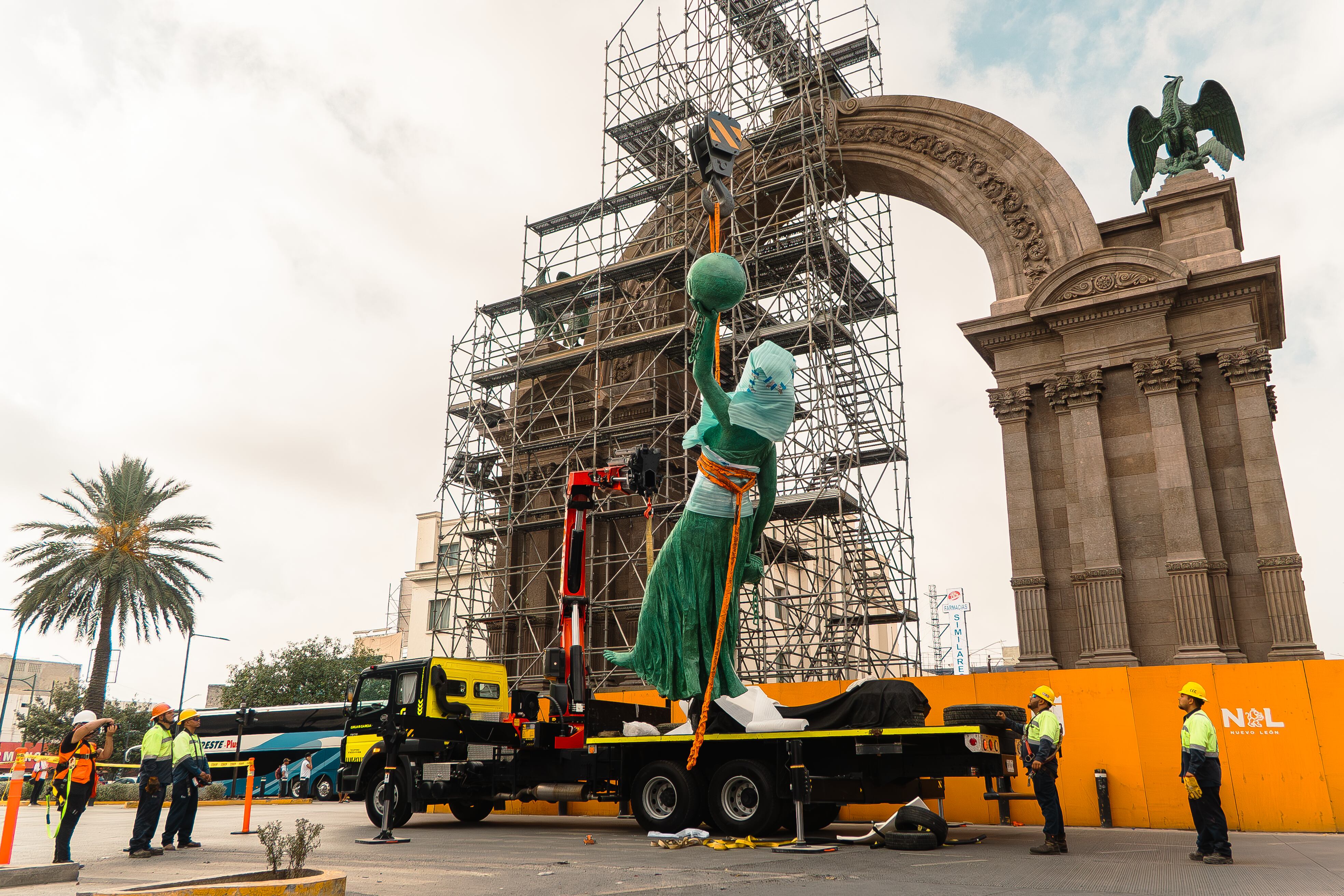 Para lograr el objetivo en un marco de seguridad, se contó con el apoyo de diferentes dependencias de Gobierno del Estado como Protección Civil, Fuerza Civil, así como Seguridad y Vialidad y Tránsito del Municipio de Monterrey, para acompañar al equipo de la empresa del restaurador a cargo de la segunda etapa de intervención, José Morales Zúñiga, para realizar la maniobra sin incidentes.