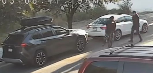 Posteriormente se pone de pie, ingresa en su camioneta mientras que el agresor se dirige a su vehículo, saca algunos objetos y posteriormente sube a la unidad junto a la víctima.