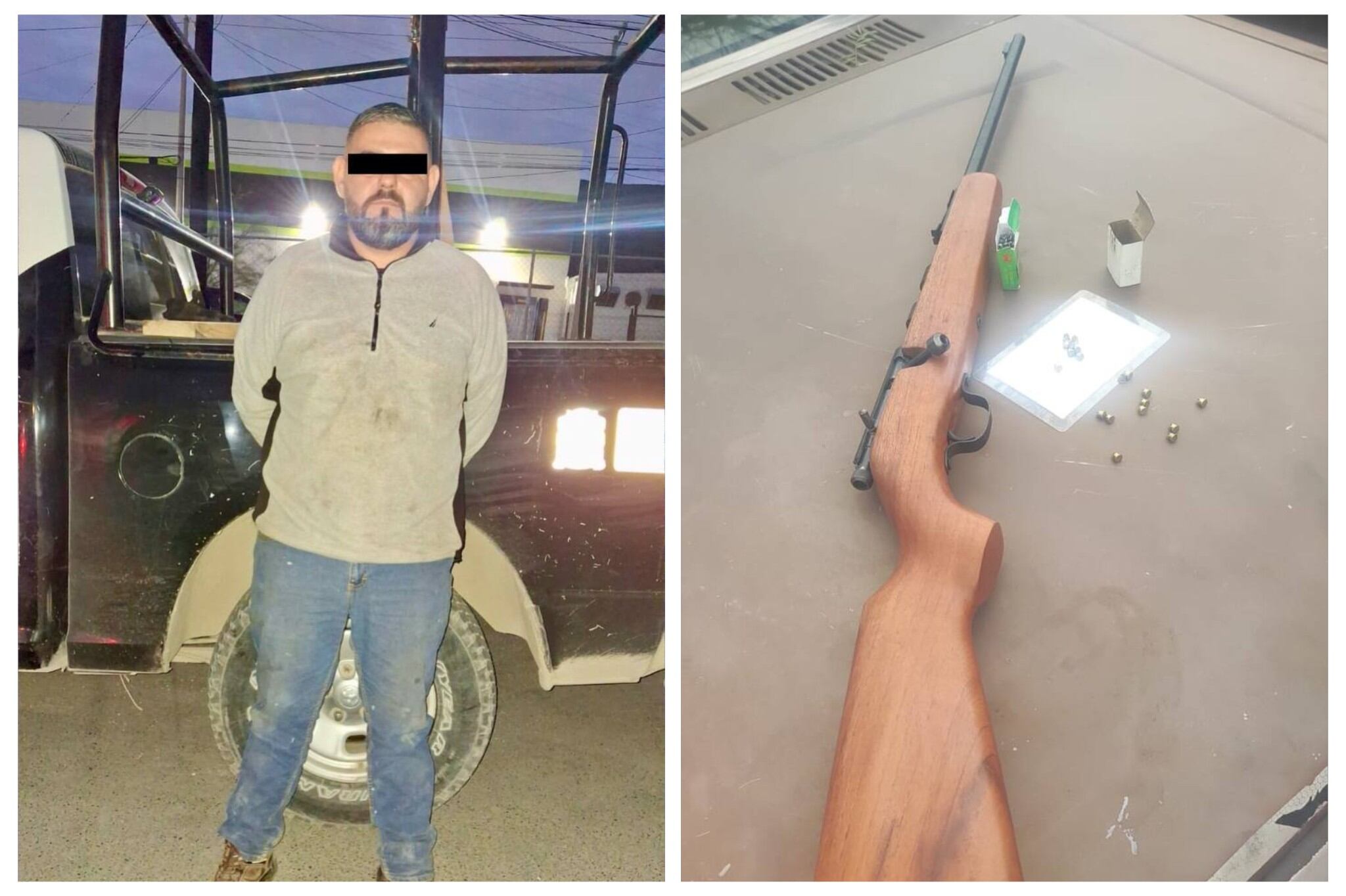 Tras solicitar su consentimiento para una revisión precautoria, los oficiales encontraron en su posesión un rifle de postas y municiones de calibres 5.5 mm y 22 milímetros.