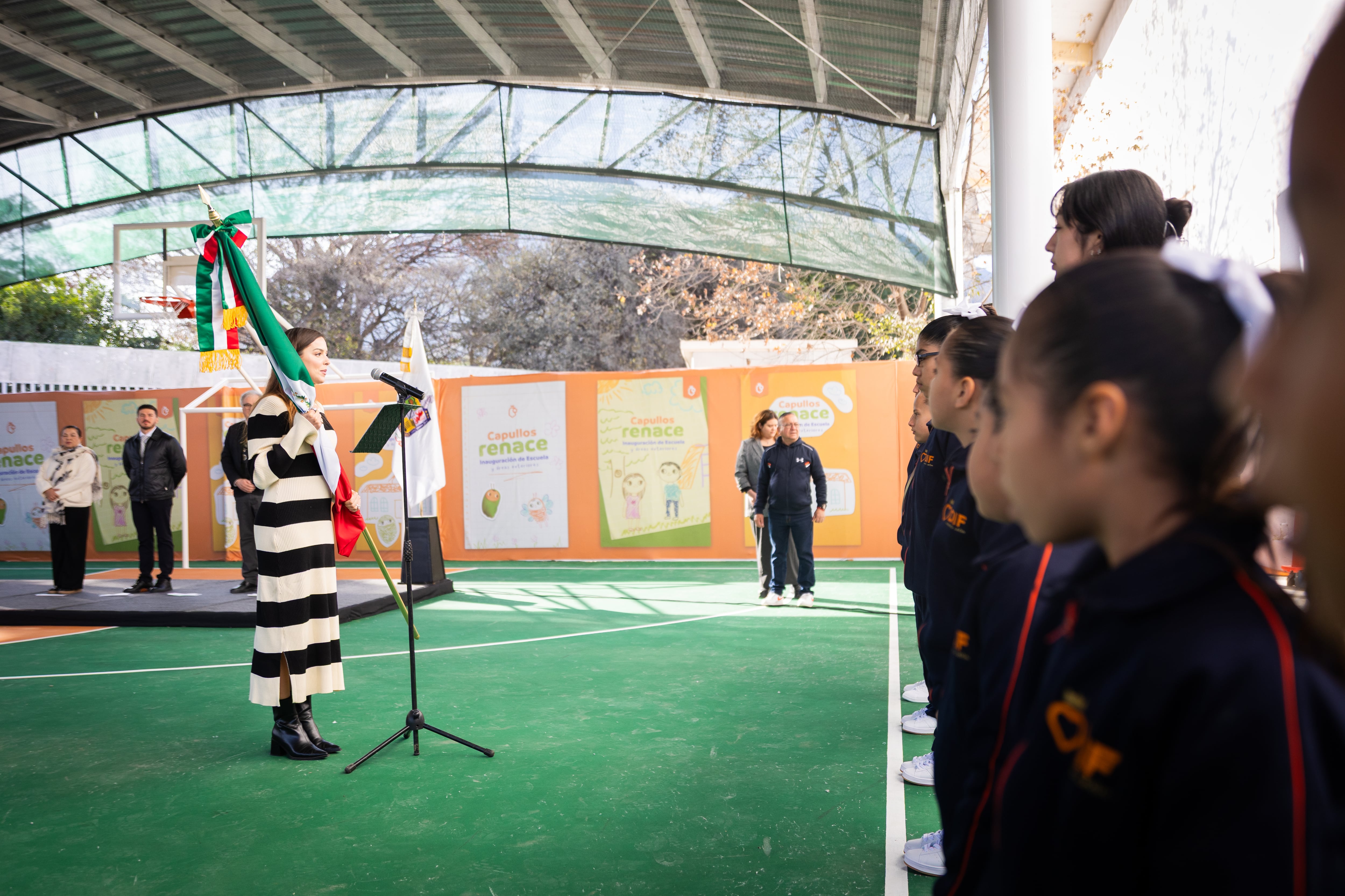 Durante la puesta en marcha de la nueva escuela de Capullos, además de abanderar a la escolta del plantel, Mariana Rodríguez destacó la importancia de la educación como un pilar fundamental para el desarrollo de la niñez y adolescencia que se encuentra bajo resguardo del Estado.