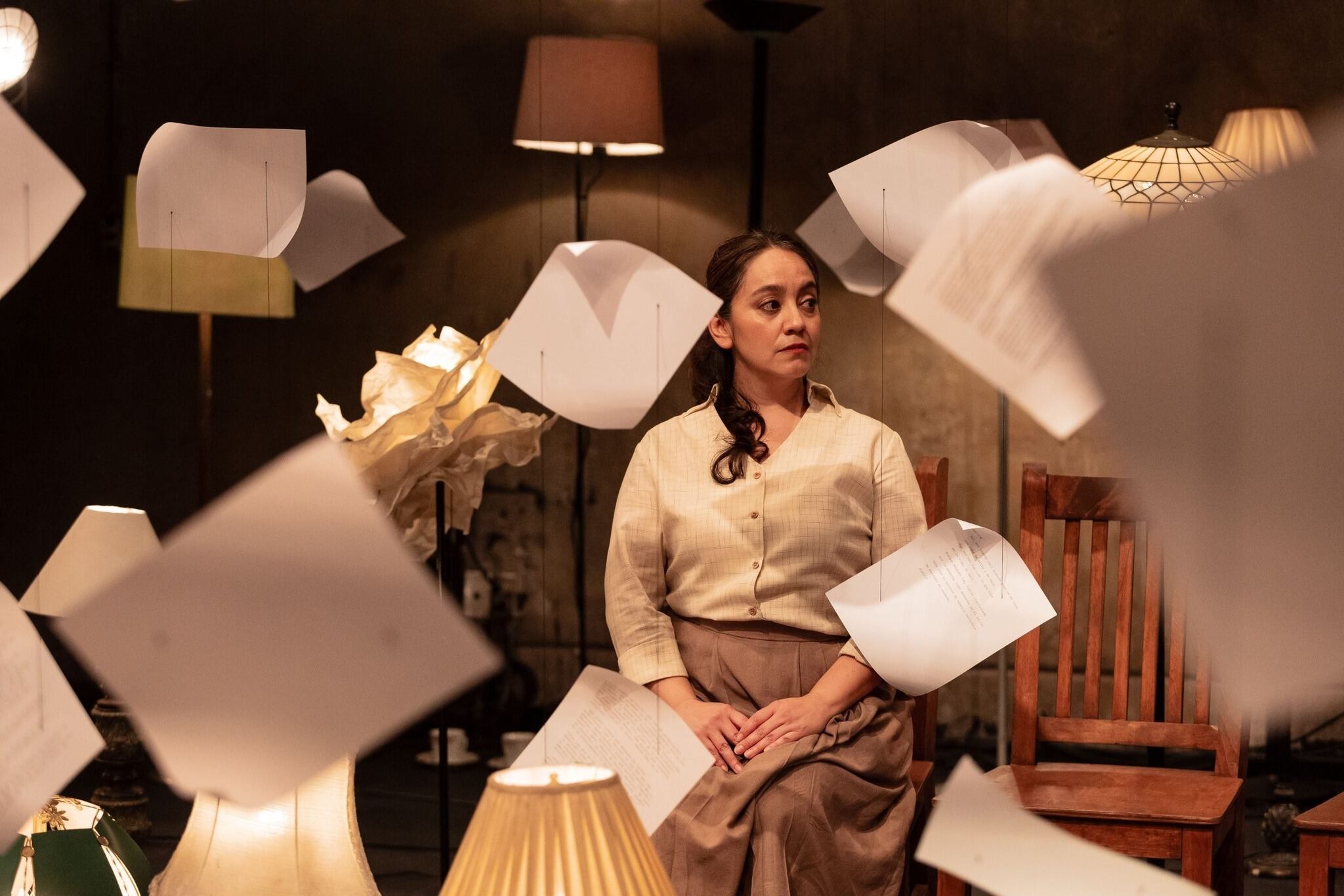 El escenario se llena de 100 lámparas, reflejo simbólico de las “luces” de su centenario y de su ingenio, pero también las lámparas representan la luz del conocimiento, la memoria y el destino trágico de Castellanos. Cuando vemos su infancia en Chiapas que fue marcada por el racismo, el clasismo y la condición de mujer en una sociedad desigual.