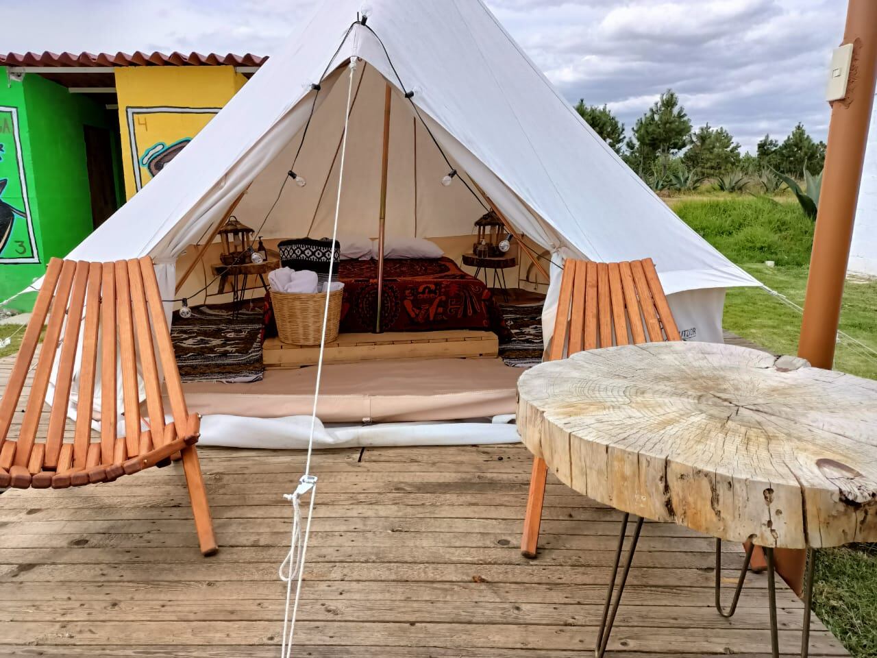 Se ubica en una enorme propiedad llamada Rancho La Soledad y dispone de tiendas de campaña bellamente decoradas y nada más al entrar lo primero que llama la atención es el cobertor de colores llamativos que hace alusión a las 400 familias tlaxcaltecas, a un lado, dos tapetes hechos a manos por artesanos de un pueblo llamado Contla.