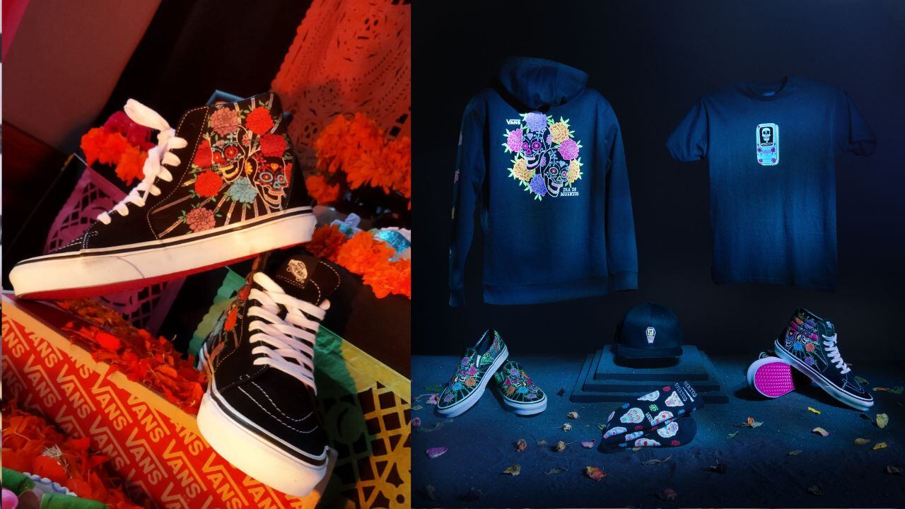 Además de los tres diseños, Vans decidió consentir a los mexicanos y creó playeras, sudaderas, cangureras y gorras diseñadas con estampados individuales de calaveritas de azúcar y flores cempasúchil en tonos neón, ideales para la temporada.