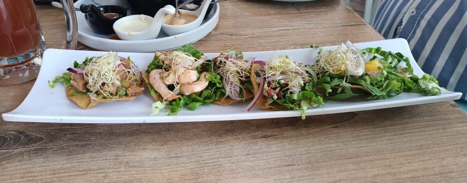Mi acompañante y yo, que ya lo hemos visitado en algunas ocasiones, pedimos para compartir un Plato de tostaditas, son cinco de tamaño mini: de atún, camarón, ceviche de pescado, jaiba y pulpo al ajillo que son un excelente comienzo; unos ostiones rasurados y una orden de tres Tacos Tritón, una exquisita combinación de camarón, pulpo y calamar, marcado como uno de los 5 consentidos del Patrón, por lo que es garantía de que te van a encantar, tal como a nosotros.