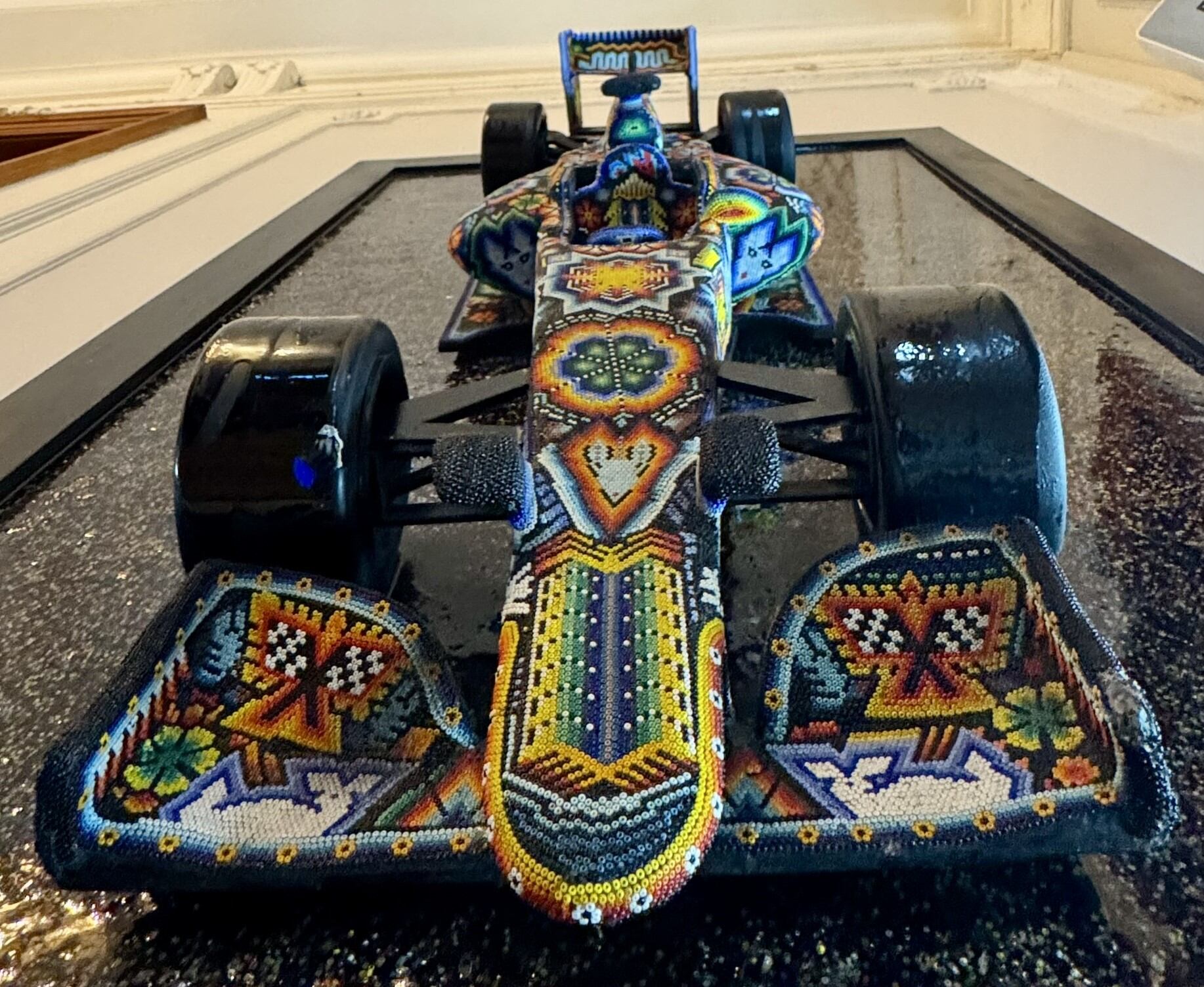 Bajo la arquitectura única de Madre Café y con el patrocinio de Grupo Modelo, Menchaca desveló su homenaje a Checo Pérez: Trascender, una obra con 6 millones de cristales, fruto de 2 años del trabajo de 20 personas, unidas por el amor hacia el arte huichol, representa la iconografía, cultura y visión de este deporte. Sin duda alguna, “la fusión de muchas voluntades es cuando se logran grandes oportunidades”, dijo el artista.