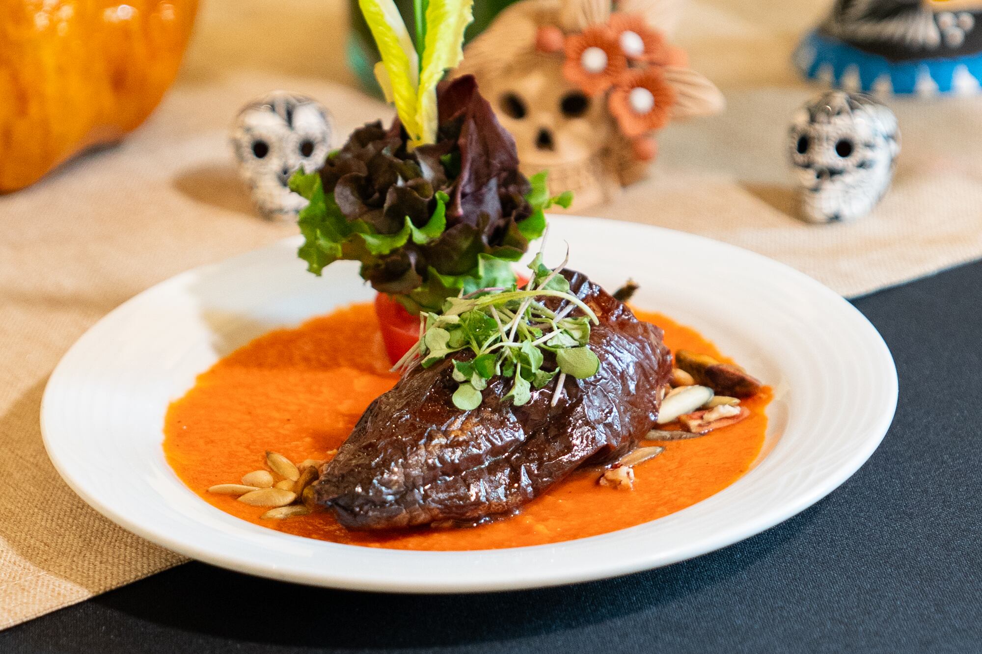 En esta edición, ha diseñado un menú que rinde tributo a los ingredientes de temporada y a los sabores que evocan las ofrendas: chile ancho, chocolate, calabaza de castilla, xoconostle, ciruela roja y chipotle.