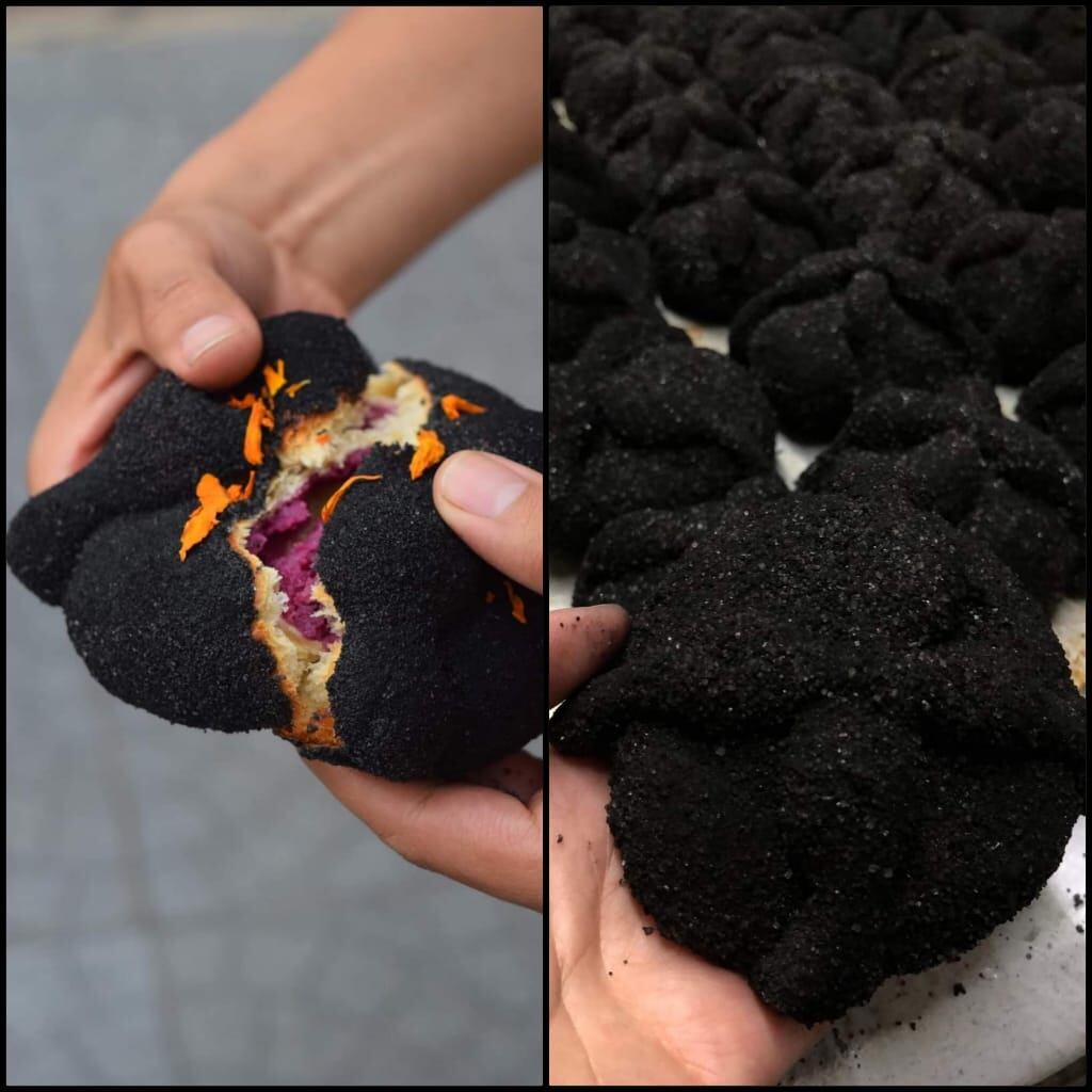 Sí, como lo leíste, pan de muerto negro, el cual es un pan tradicional de hojaldra rellena de dulce de camote morado y cubiertas con ceniza de totomoxtle, que es la hoja que cubre al maíz quemada, y azúcar.