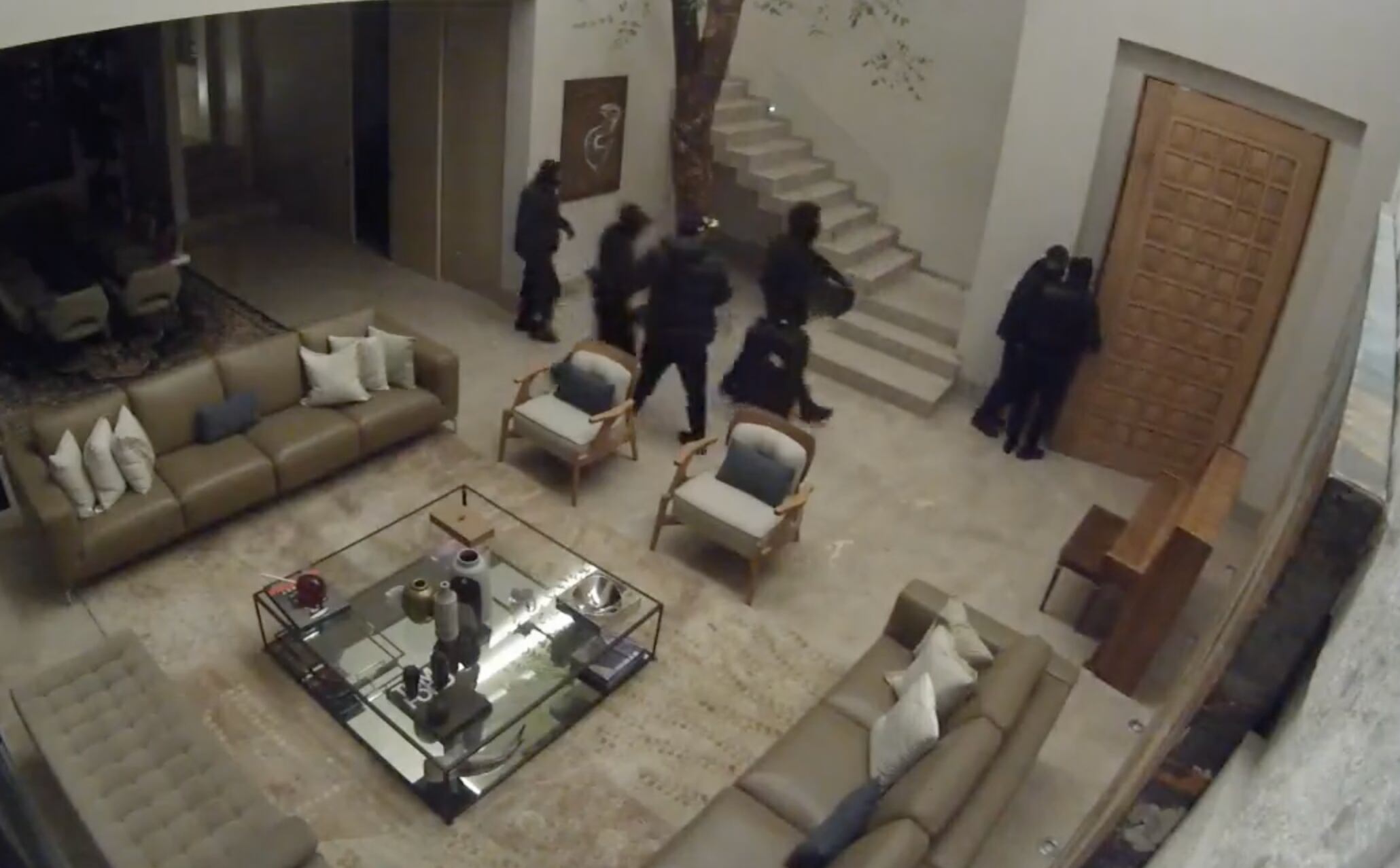 En redes sociales circuló un video en el que se aprecia a siete hombres vestidos de negro, descendiendo de la planta alta a toda prisa, por la escalera y casi de forma coordinada, otros tres hombres salen de la parte izquierda con lo que se aprecia como una maleta grande.