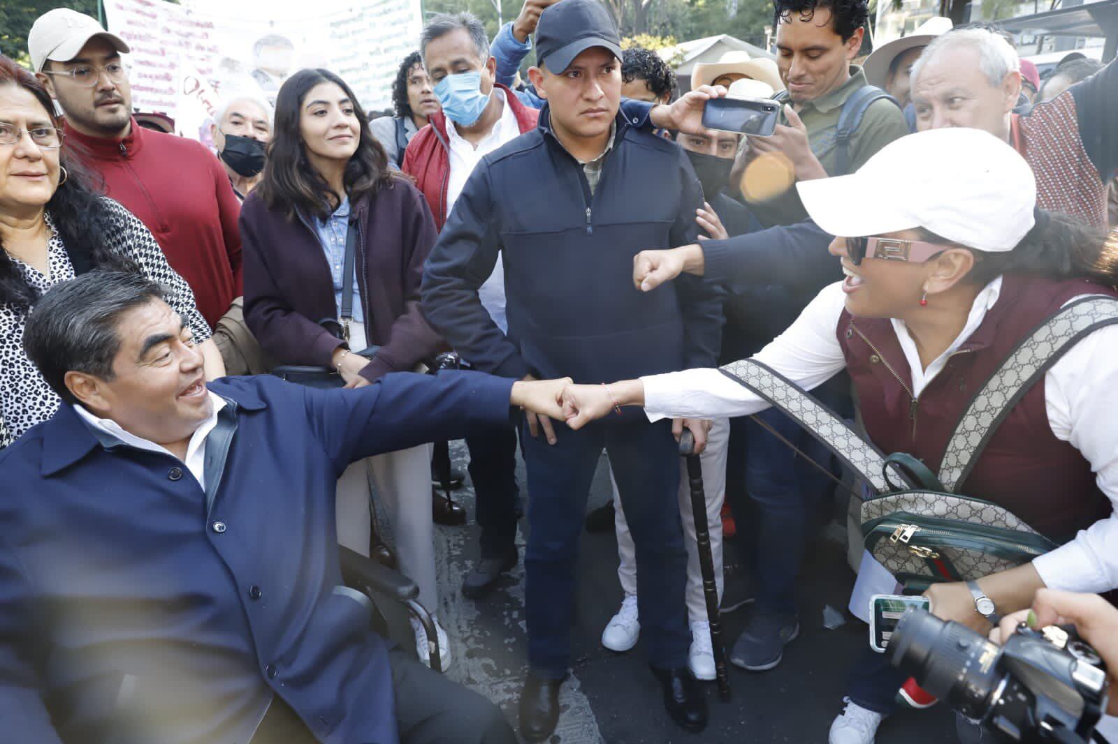 El mandatario poblano participó en la movilización pero en silla de ruedas, desde donde saludó a diversos militantes, manifestantes y al propio mandatario federal, a quien le recordó que en Puebla seguirán trabajando a favor de su proyecto de nación.