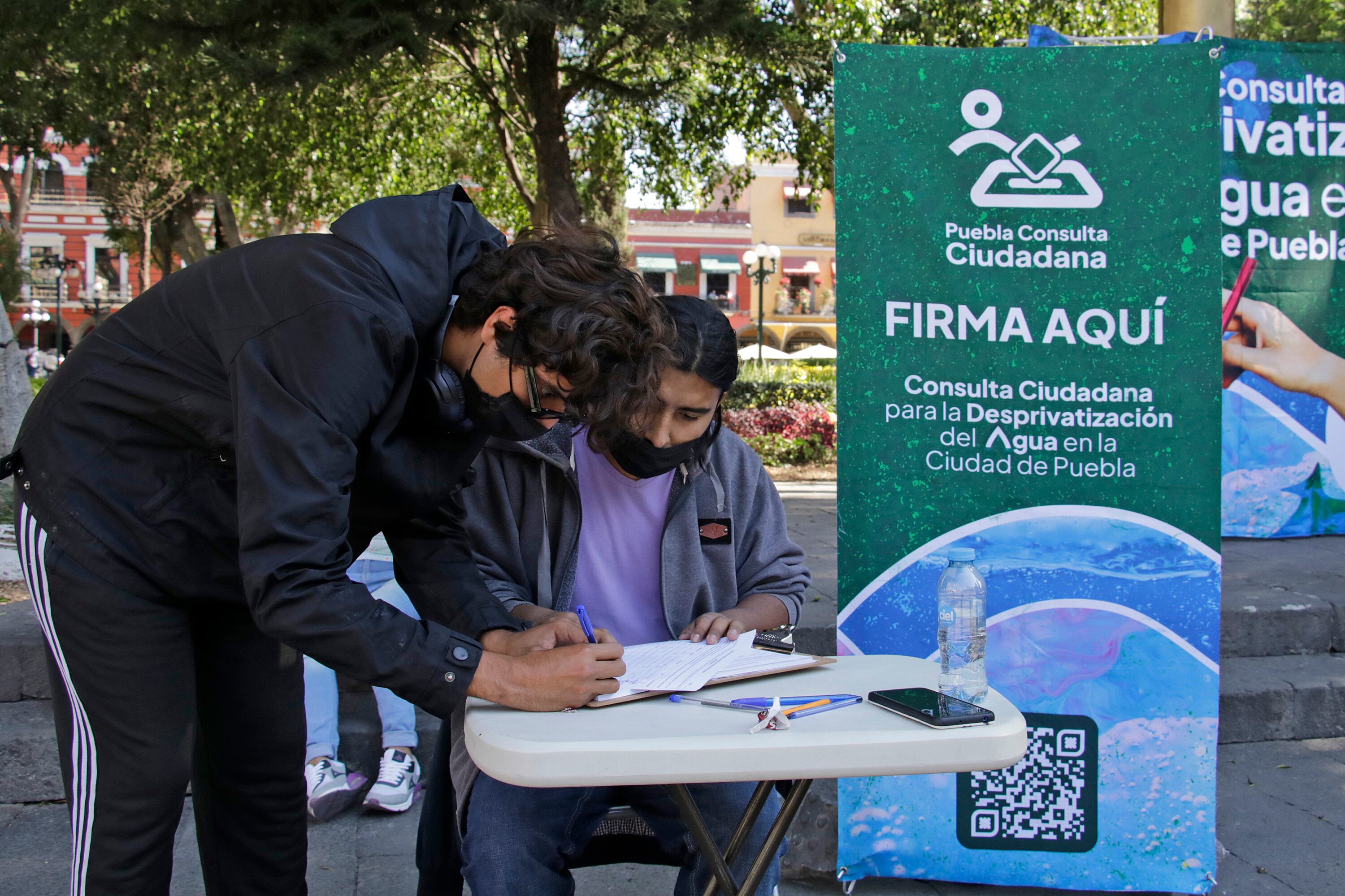 Desde hace semanas, con el respaldo de legisladores del partido Morena, colectivos instalaron mesas en el zócalo de la ciudad para recolectar firmas y solicitar la desprivatización del servicio de agua potable en Puebla, a través consulta ciudadana.