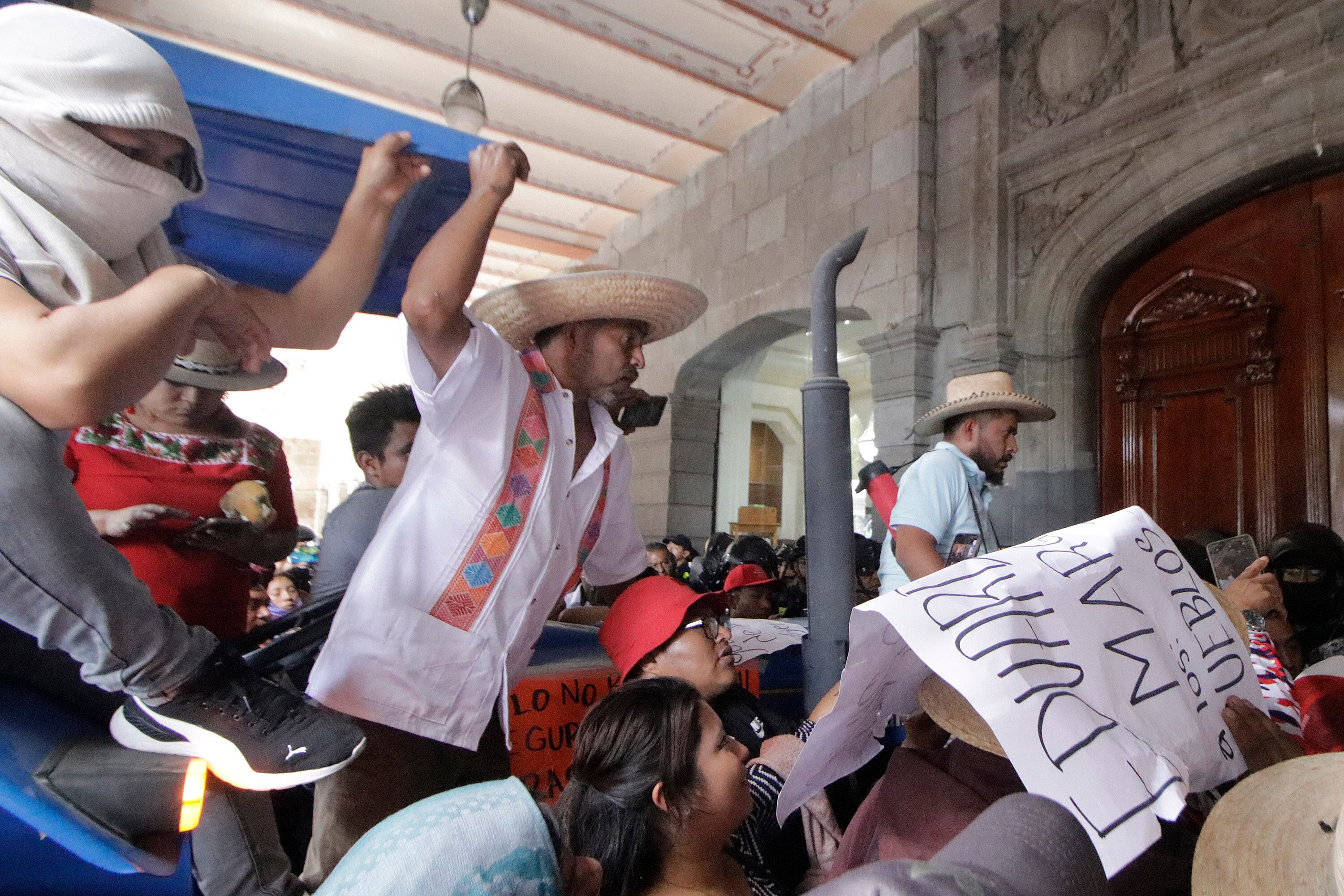 No obstante, la manifestación subió de tono y los habitantes amenazaron con tirar las puertas del Palacio Municipal de la capital con un tractor, además de que lanzaron piedras contra los granaderos y los ventanales de las oficinas de turismo.