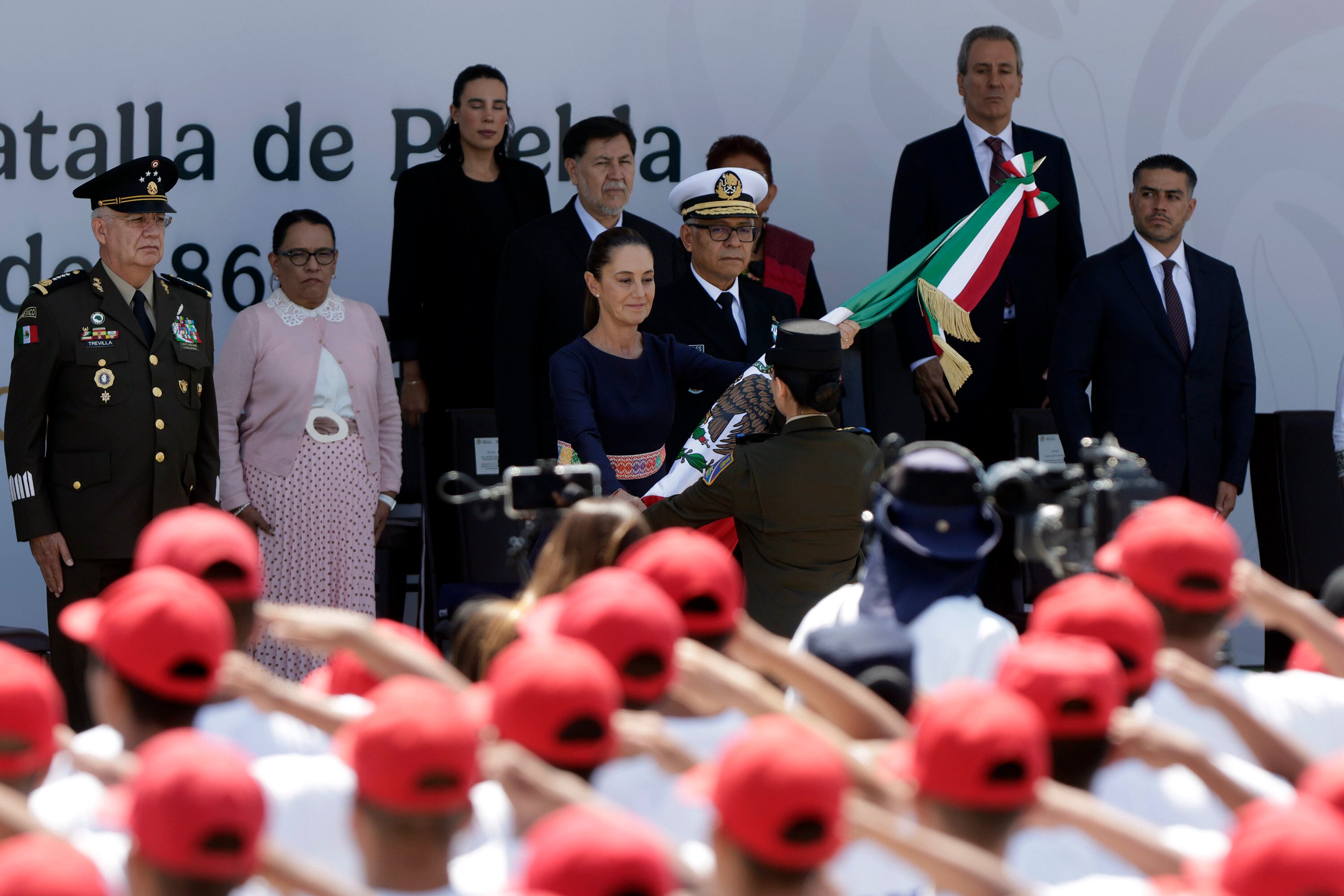 Durante la ceremonia en el Mausoleo a Ignacio Zaragoza, la presidenta presidió el homenaje a los héroes de 1862, donde también tomó protesta a cadetes del Servicio Militar Nacional (SMN).